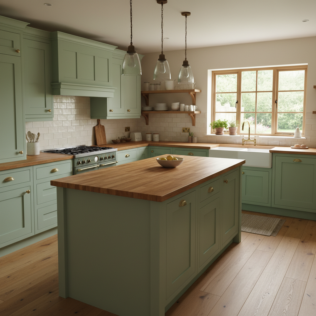 If full sage cabinets feel too bold, consider painting your kitchen walls in a muted sage green. This allows you to introduce the calming color without committing to it on all cabinetry. Pair with crisp white or cream cabinets for a fresh contrast. Add potted herbs on windowsills and rustic wooden shelves to enhance the natural, homely vibe. The mood is light, fresh, and subtly elegant.