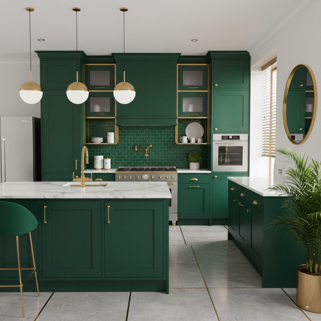 Vibrant emerald and deep forest greens offer a more saturated and dramatic approach to green kitchens. These hues are bold, luxurious, and full of character, perfect for making a statement. They evoke the richness of precious gemstones and dense woodlands, bringing a sense of depth and personality to your culinary space.