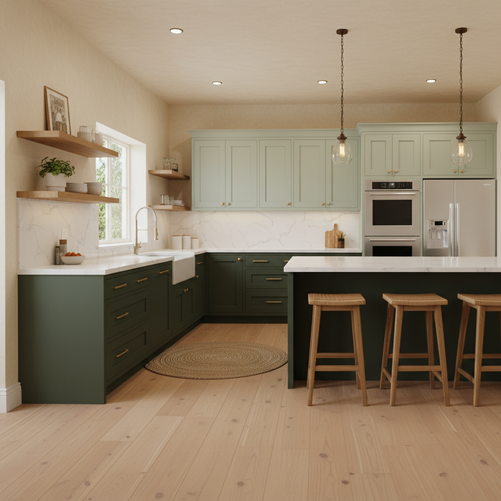 Create dynamic visual interest with two-tone green cabinets. Consider deep olive green for lower cabinets to ground the space, and a lighter sage or mint green for upper cabinets to keep the eye moving upwards and the space feeling open. This approach adds depth and sophistication, especially when paired with a neutral countertop and backsplash to tie the two greens together.