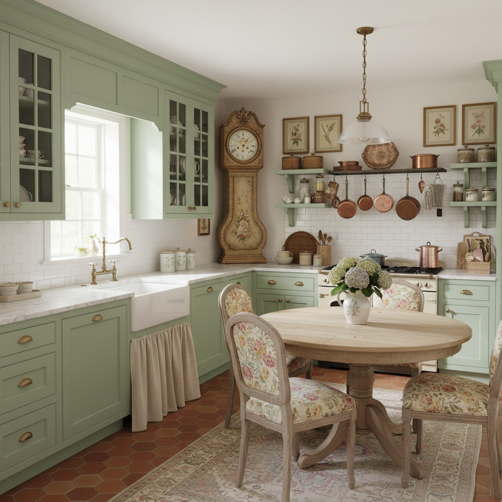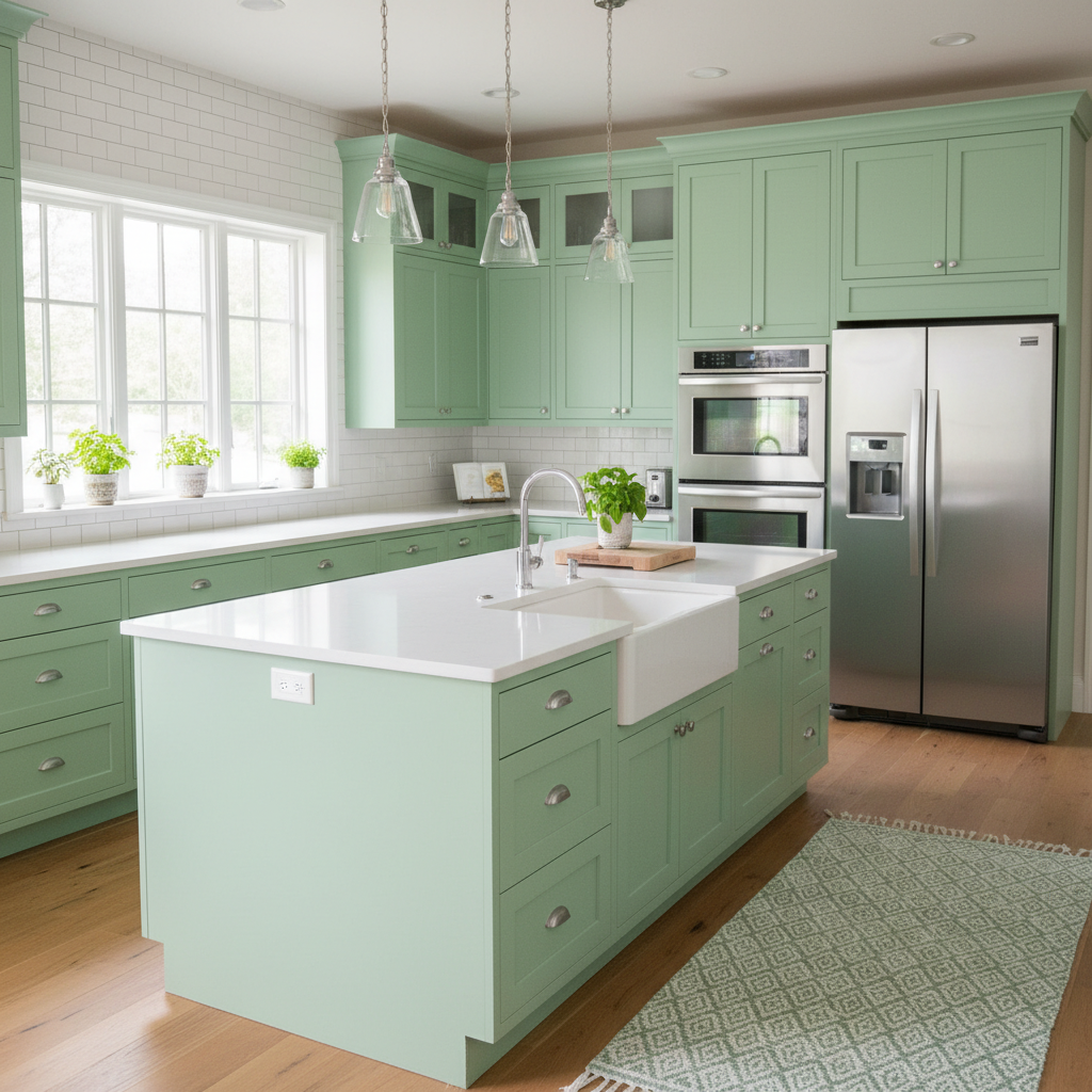 Opt for a delicate pastel green across your cabinetry for a charming, almost whimsical look. This soft shade works wonderfully in a vintage-inspired kitchen, paired with retro appliances and open shelving displaying colorful dishware. Light wood flooring and white walls will keep the space feeling open and airy. The atmosphere is sweet, nostalgic, and incredibly welcoming.