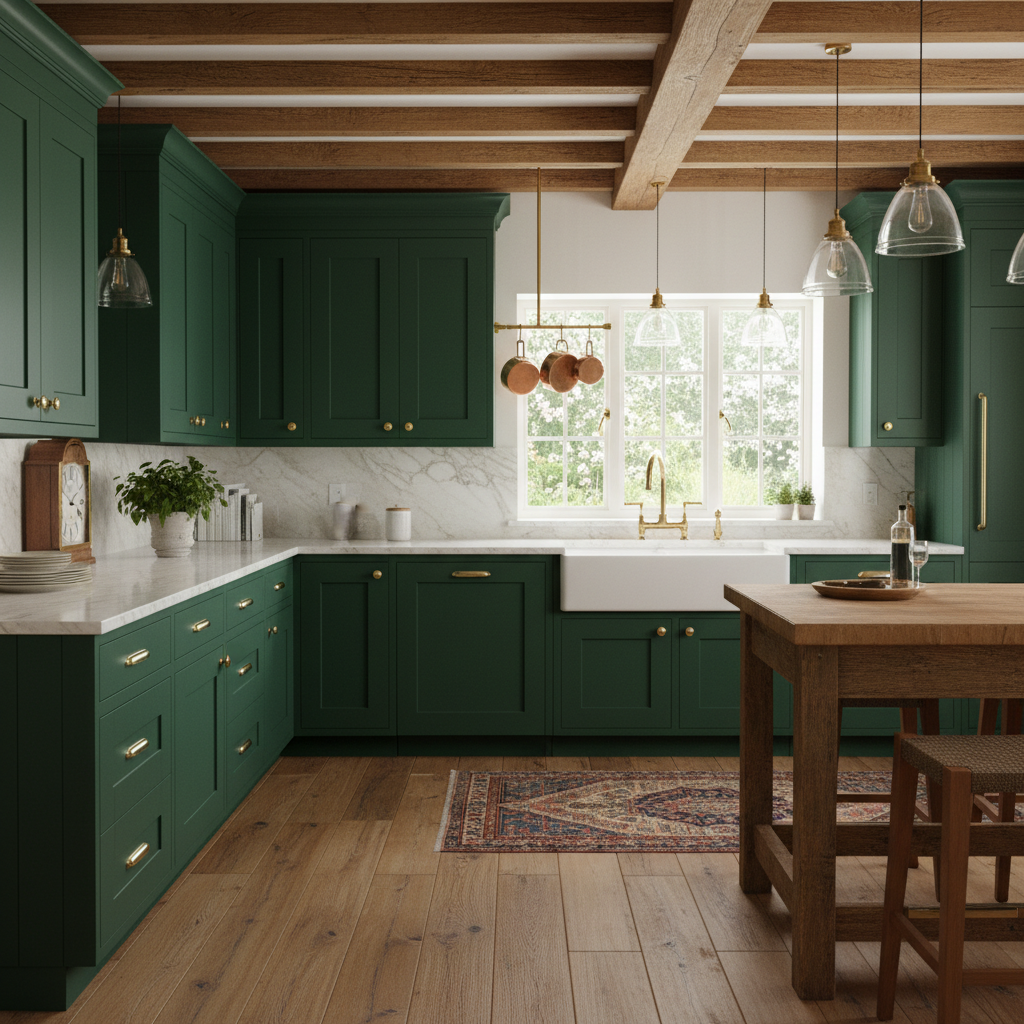 For a timeless and stately look, opt for hunter green cabinetry in a more traditional style, such as shaker or raised panel. This classic shade of green pairs beautifully with polished brass hardware, a deep farmhouse sink, and butcher block or dark granite countertops. It evokes a sense of heritage and comfort, making the kitchen feel like a cozy, inviting heart of the home.