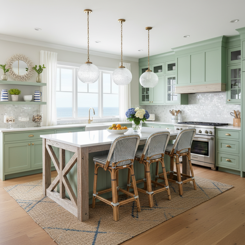 Bring the calming essence of the ocean into your kitchen with seafoam green cabinetry. This blue-green hue creates a serene, tranquil atmosphere, perfect for a coastal-inspired home. Pair with natural textures like rattan light fixtures, wicker chairs, and light-colored wood flooring. White countertops and a shell-patterned backsplash would complete this peaceful retreat.