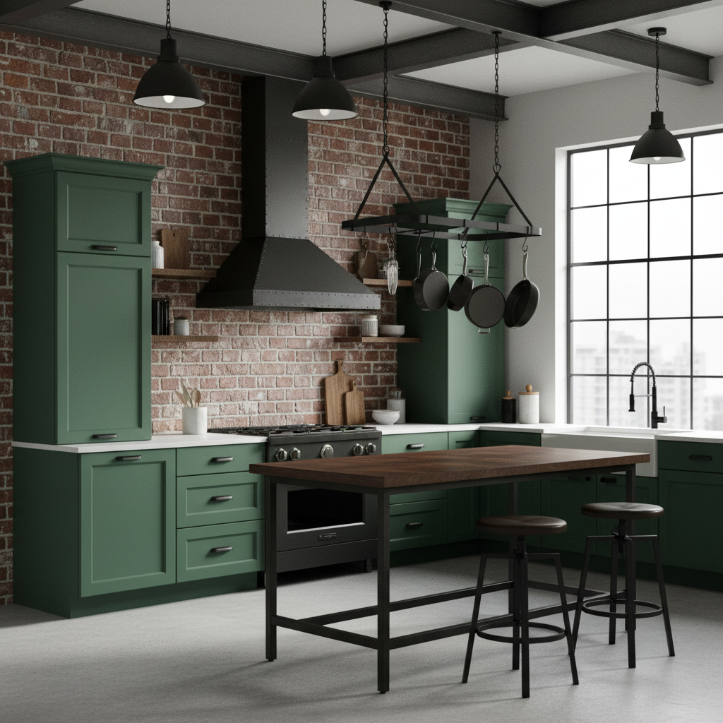 Combine deep forest or olive green cabinets with industrial elements for a chic, edgy look. Think exposed brick walls, black metal shelving, concrete countertops, and perhaps even a concrete floor. The warmth and depth of the green soften the industrial harshness, creating a balanced and sophisticated space. This concept is perfect for loft apartments or urban homes seeking a unique character.