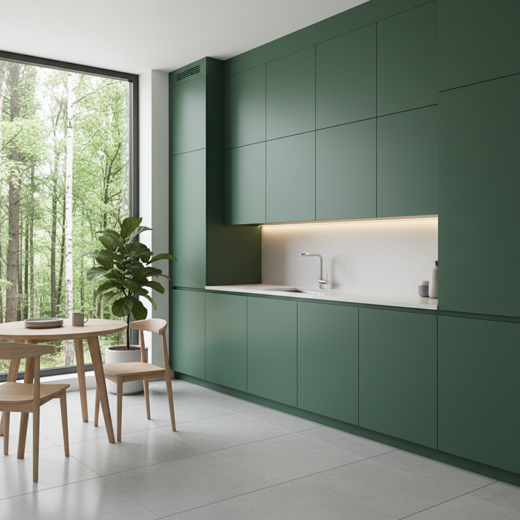 Embrace modern minimalism with sleek, handleless forest green cabinets. This deep, rich green creates a sophisticated backdrop for clean lines and uncluttered spaces. Pair with concrete countertops or dark composite materials for an industrial-chic edge. Integrated appliances disappear seamlessly, allowing the depth of the forest green to truly shine. The atmosphere is refined and effortlessly cool.