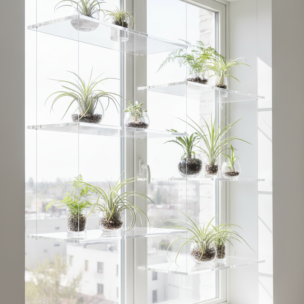 For maximum light penetration, clear acrylic or polycarbonate shelves are an excellent choice. They virtually disappear, allowing light to reach plants on lower levels without obstruction. This creates a bright, airy, and modern aesthetic, perfect for orchids or delicate seedlings.