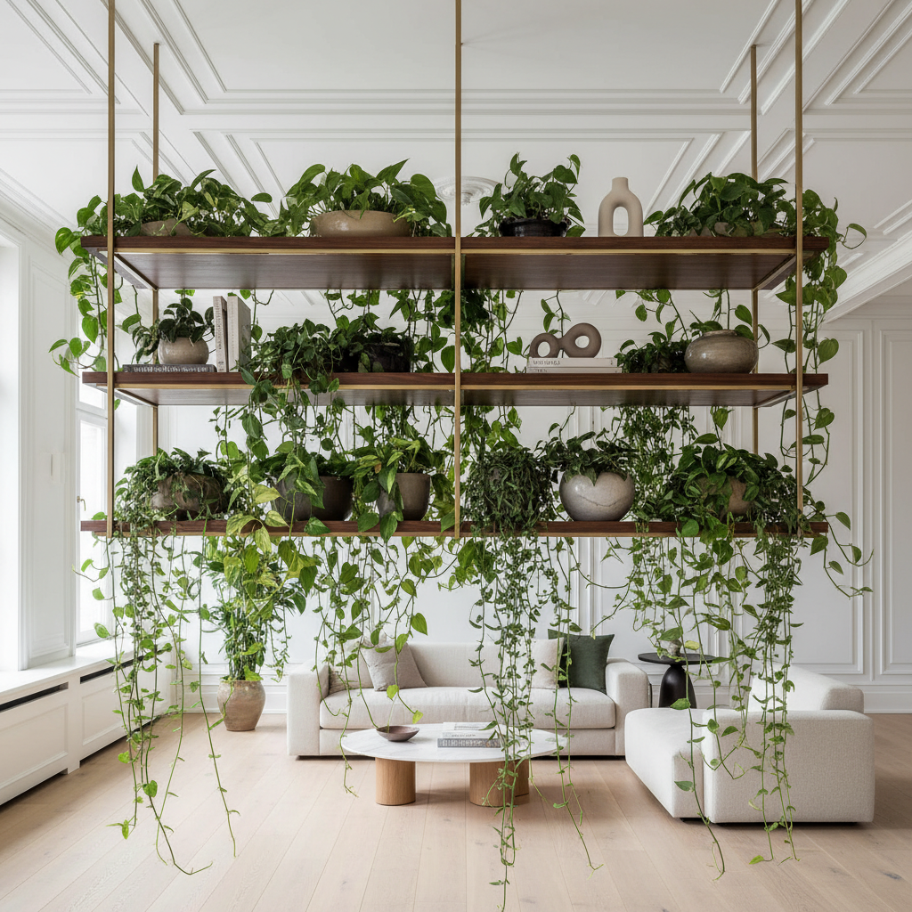 When floor space is limited, look up! Ceiling-hung shelves or baskets are a clever way to add storage without cluttering the ground. They create a beautiful cascading effect with trailing plants and can be suspended at various heights to maximize vertical space.