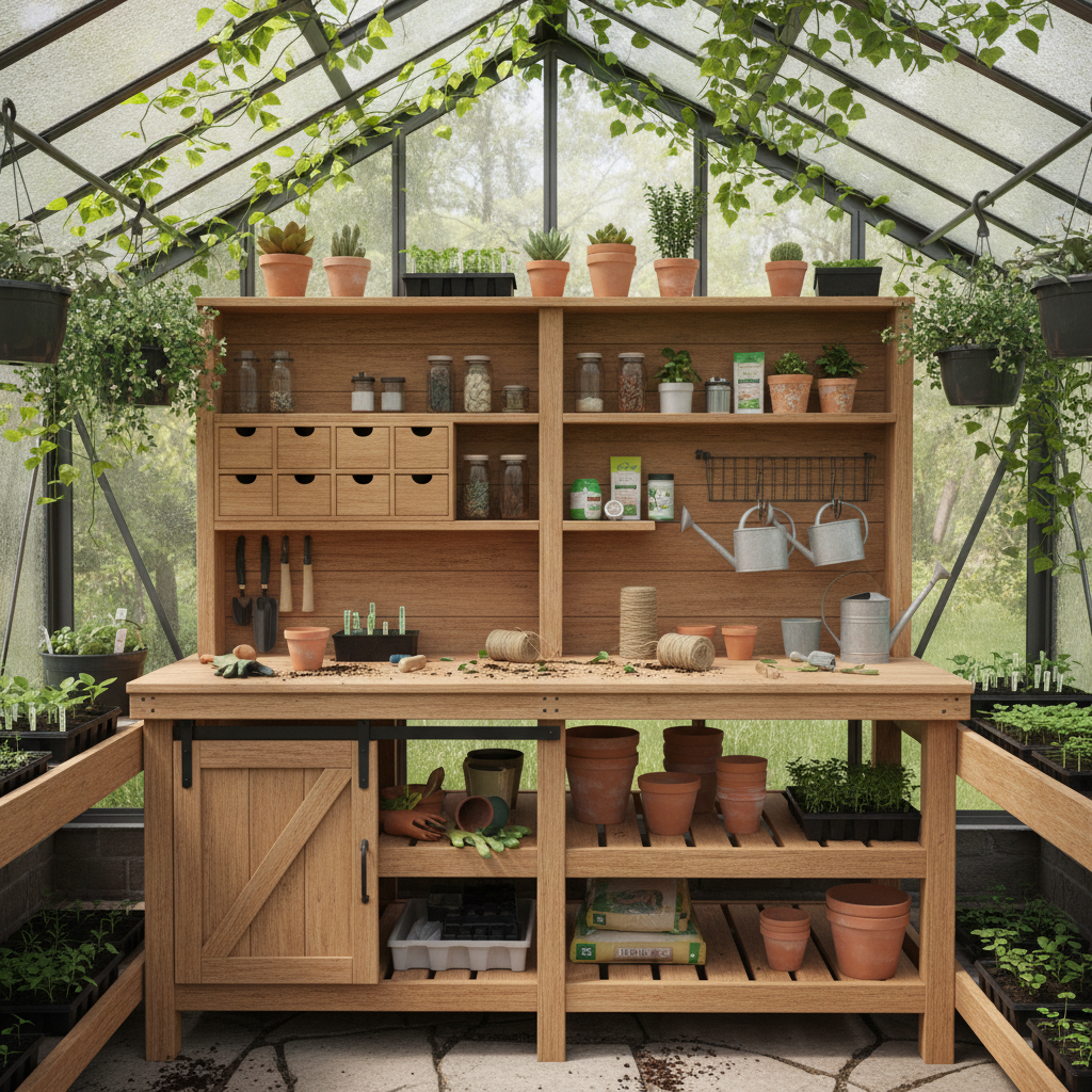 Combine workspace and storage with a potting bench featuring integrated shelves. This central hub for all your gardening tasks provides a convenient surface for mixing soil, repotting, and organizing tools, with shelves below for pots, soil bags, and supplies. It creates an efficient and tidy workstation.