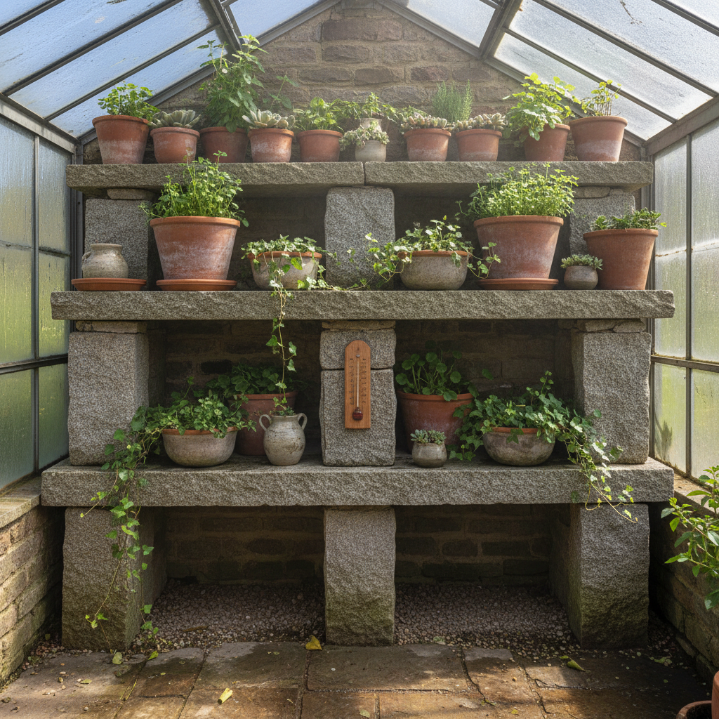 Stone or concrete shelves are excellent for adding thermal mass to your greenhouse, helping to regulate temperature fluctuations. Their robust, earthy appearance provides a grounding element and is perfect for heavy pots or for creating a natural, architectural feel.
