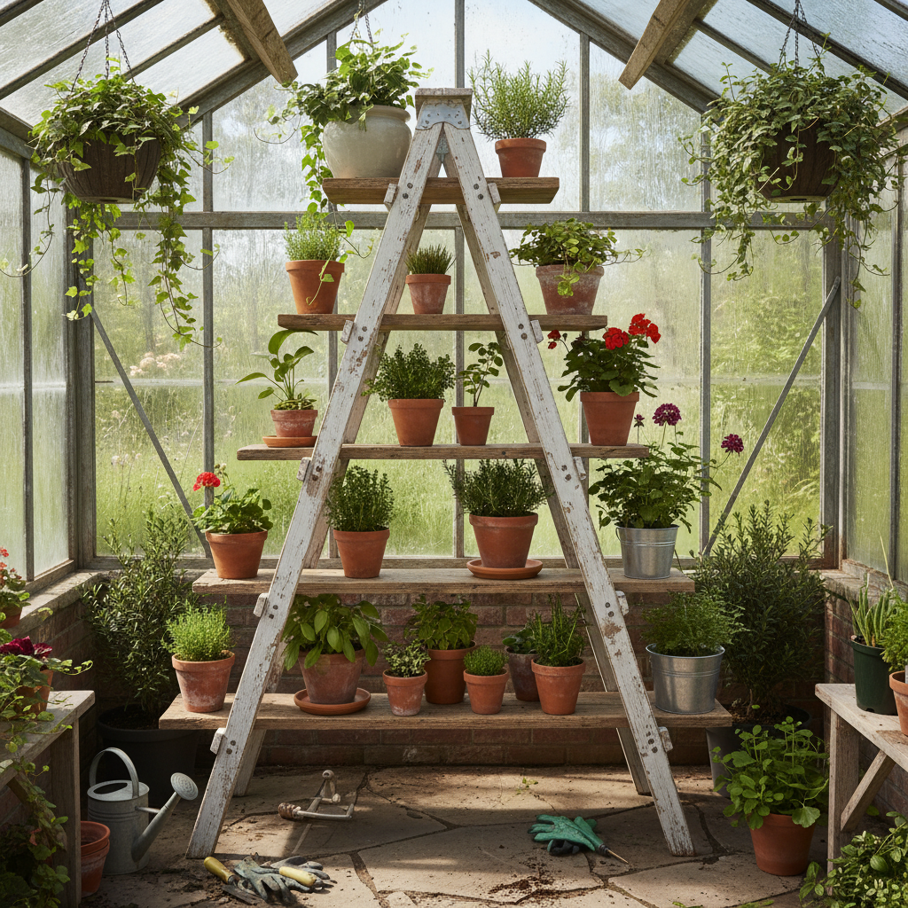 Infuse character and charm into your greenhouse with repurposed ladder shelves. An old wooden ladder can be transformed into a unique tiered display, offering a whimsical and eco-friendly storage solution. This adds a touch of rustic elegance and a story to your space.