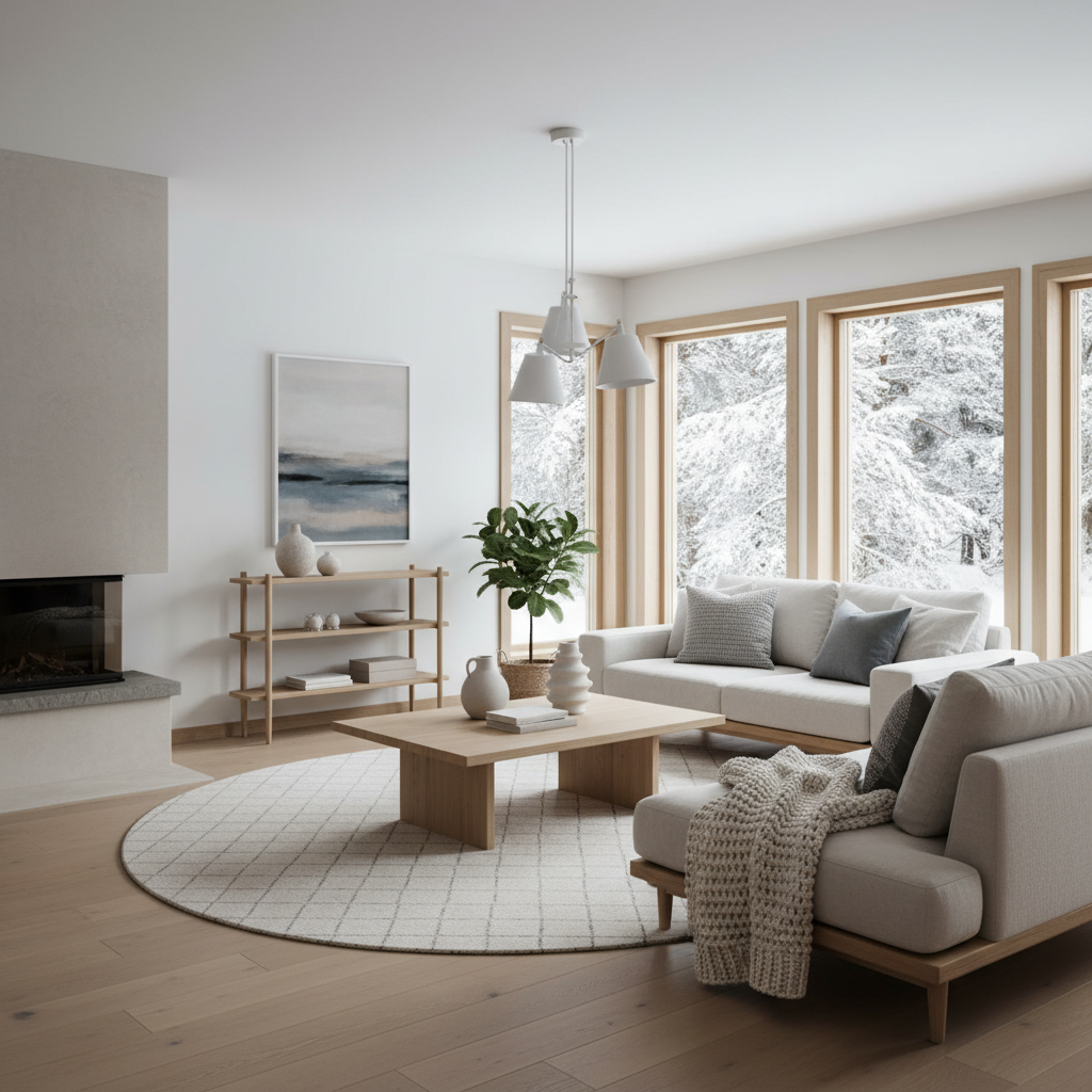 Experience grand comfort with Scandinavian Hygge Luxury, a style that prioritizes warmth, coziness, and natural elements, all with a refined edge. The color palette is typically light and airy—whites, pale grays, and soft pastels, grounded by natural wood tones. Materials like light-toned wood (birch, ash), wool, sheepskin, linen, and ceramic are essential, creating a sense of tactile comfort. Furniture silhouettes are clean, functional, and ergonomically designed, often featuring soft curves. The mood is one of serene comfort, inviting warmth, and understated elegance.