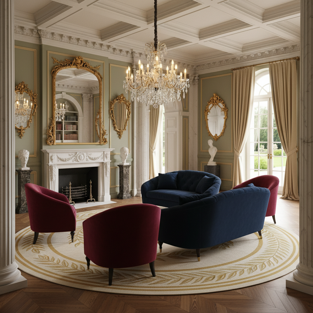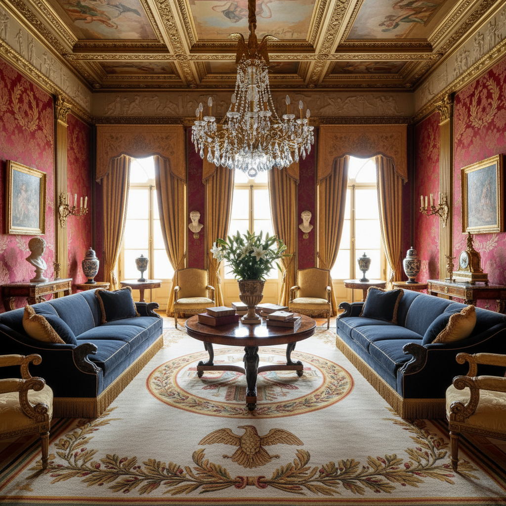 Inspired by Napoleonic aesthetics, Empire Style Grandeur is characterized by its imperial motifs, monumental forms, and rich, often military-inspired, ornamentation. The color palette favors deep reds, royal blues, emerald greens, and rich creams, heavily accented with gold. Materials include mahogany, bronze, marble, and sumptuous silks and velvets. Furniture silhouettes are often rectilinear and imposing, featuring classical motifs like laurel wreaths, eagles, and sphinxes. The atmosphere is one of formal majesty, historical power, and regal opulence.