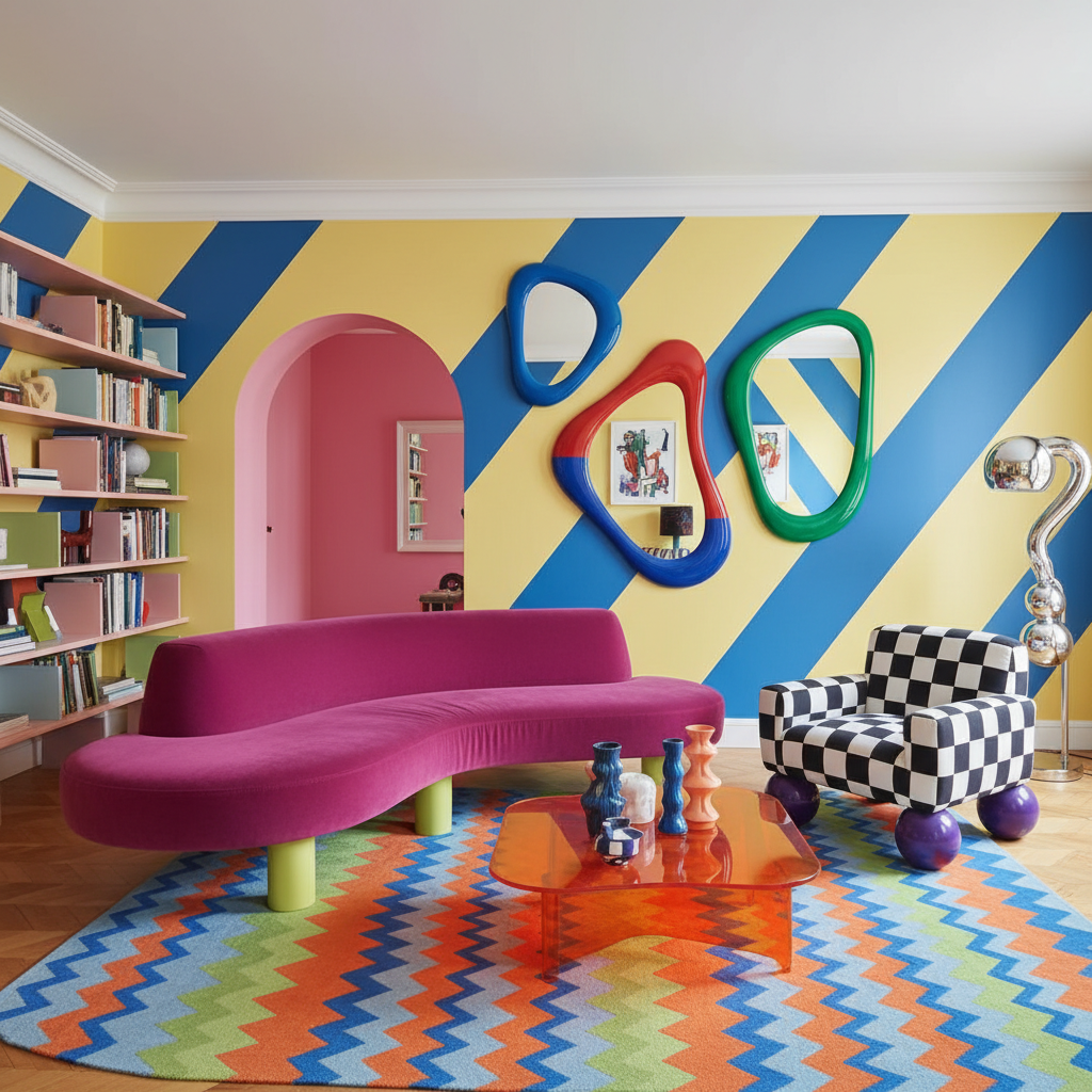 For those who appreciate avant-garde luxury, Postmodern Playfulness offers a grand, unconventional approach. This style embraces bold colors, unexpected shapes, and a sense of artistic experimentation. The color palette is vibrant and eclectic, often featuring primary colors, pastels, and high-contrast combinations. Materials include laminates, plastics, glass, and unconventional metals, paired with plush, often unusually shaped, upholstery. Furniture silhouettes are sculptural, often asymmetrical, and challenge traditional forms. The mood is one of creative grandeur, intellectual playfulness, and unique sophistication.