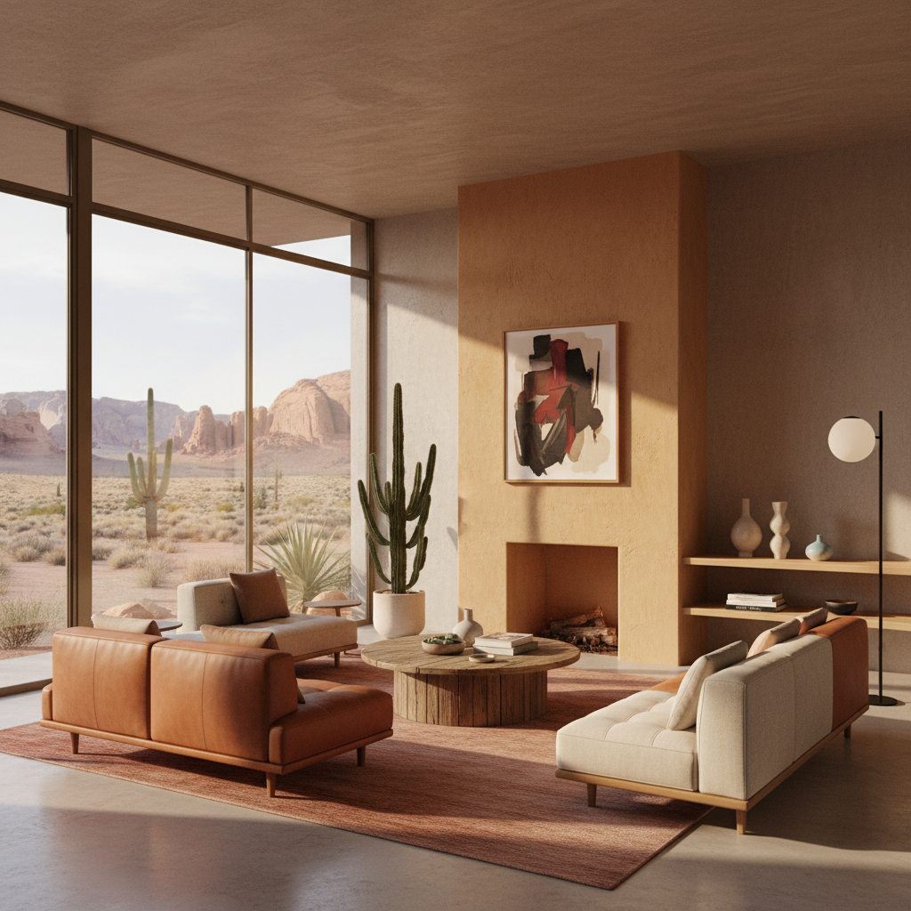 Drawing inspiration from arid landscapes and mid-century design, Desert Modernism offers a unique take on grandeur. This style emphasizes natural light, open spaces, and a connection to the environment. The color palette is warm and earthy—sandy beiges, terracotta, muted greens, and sky blues, often with pops of burnt orange. Materials include stucco, rough-hewn wood, leather, woven textiles, and natural stone. Furniture silhouettes are low-slung, comfortable, and often made from natural materials, blending seamlessly with the surroundings. The mood is one of serene connection to nature, relaxed sophistication, and quiet luxury.