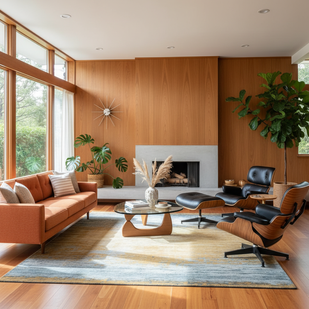 Mid-Century Modern Sophistication brings a sense of grand design through its iconic forms and timeless appeal. This style emphasizes functionality, organic shapes, and a connection to nature. The color palette is often vibrant yet sophisticated—teals, oranges, mustards, and olives, balanced with warm wood tones and neutrals. Materials include teak, walnut, leather, wool, and glass. Furniture silhouettes are sleek, often raised on slender legs, and feature innovative, comfortable designs. The mood is one of intelligent design, retro chic, and enduring style.
