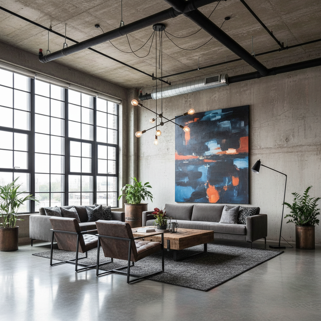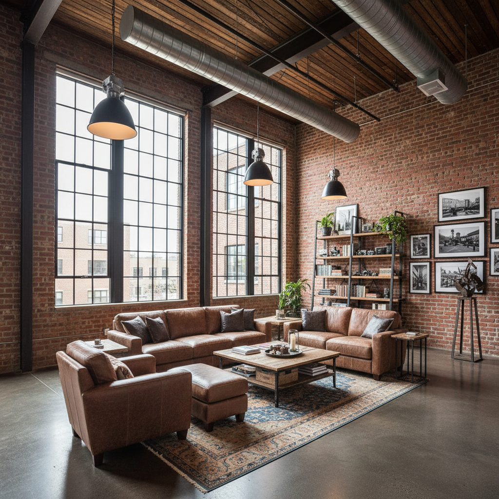 Reimagine industrial aesthetics with a grand twist. Industrial Loft Grandeur celebrates raw materials and expansive spaces, elevated by luxurious touches. Color palettes often feature deep charcoals, rich browns, and steel grays, softened by warm wood tones and vibrant art. Key materials include exposed brick, polished concrete, reclaimed wood, and dark metals like iron and steel, often complemented by supple leather and robust textiles. Furniture silhouettes are robust and substantial, often oversized, blending vintage industrial pieces with contemporary comfort. The mood is urban, sophisticated, and effortlessly cool.