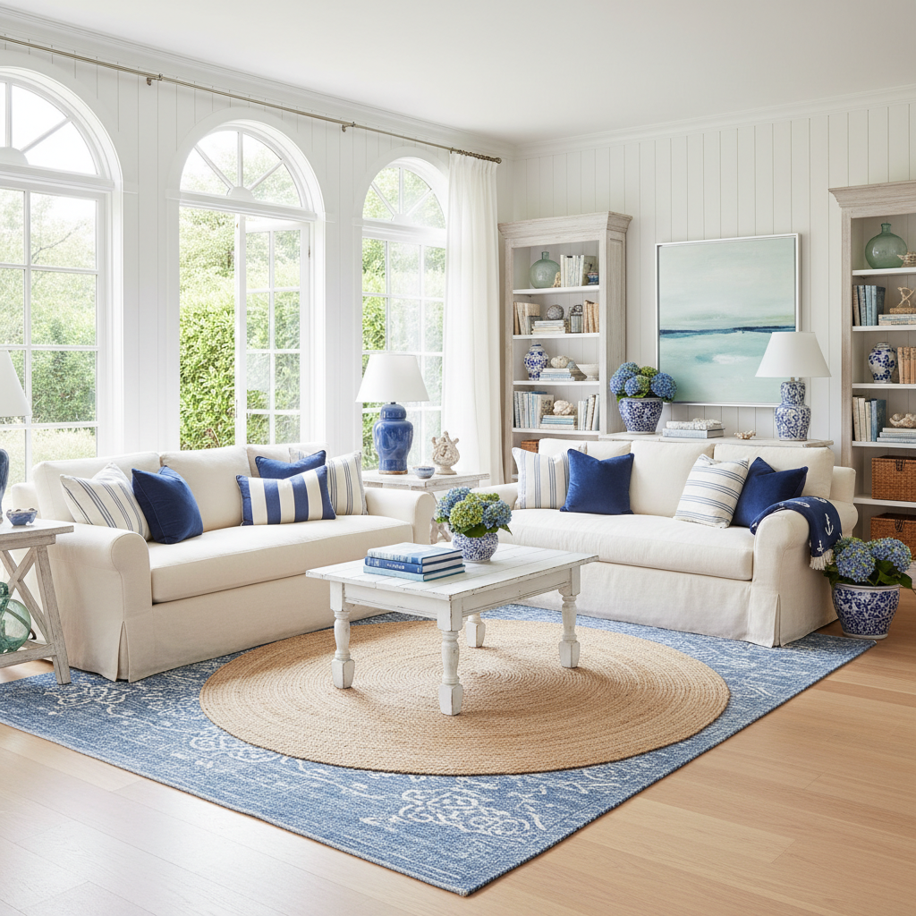 Embrace the breezy, upscale charm of Coastal Hamptons Elegance. This look brings the serenity of the beach indoors, elevated with refined details and a sophisticated palette. The color scheme is dominated by crisp whites, various shades of blue (navy, sky, turquoise), and natural sand tones. Materials include painted wood paneling, wicker, rattan, linen, and bleached oak. Furniture silhouettes are comfortable, classic, and often oversized, designed for relaxed lounging. The atmosphere is one of serene luxury, casual elegance, and timeless coastal beauty.