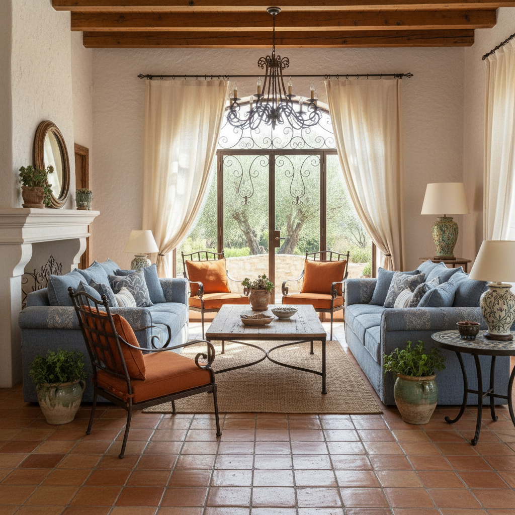 Transport your living room to the sun-drenched shores of the Mediterranean with this splendid style. It embraces natural textures, earthy tones, and rustic charm elevated by elegant details. The color palette centers on warm whites, terracotta oranges, deep blues, and olive greens. Materials such as stucco, terracotta tiles, natural stone, and dark, carved wood are prominent, often paired with wrought iron and woven textiles. Furniture is often robust and comfortable, featuring carved details and natural fibers. The atmosphere is one of relaxed luxury, warmth, and timeless beauty.