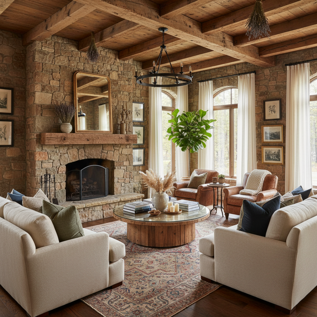 Rustic Chic Refinement marries the warmth of country living with sophisticated design. This style celebrates natural imperfections and organic textures, elevated by elegant furnishings. The color palette is earthy and inviting—warm browns, forest greens, muted blues, and creamy whites. Materials include reclaimed wood, natural stone, exposed beams, and raw iron, softened by cashmere throws, linen upholstery, and natural wool rugs. Furniture silhouettes are often substantial, comfortable, and handcrafted, blending traditional forms with modern comfort. The mood is one of cozy luxury, authentic charm, and grounded elegance.