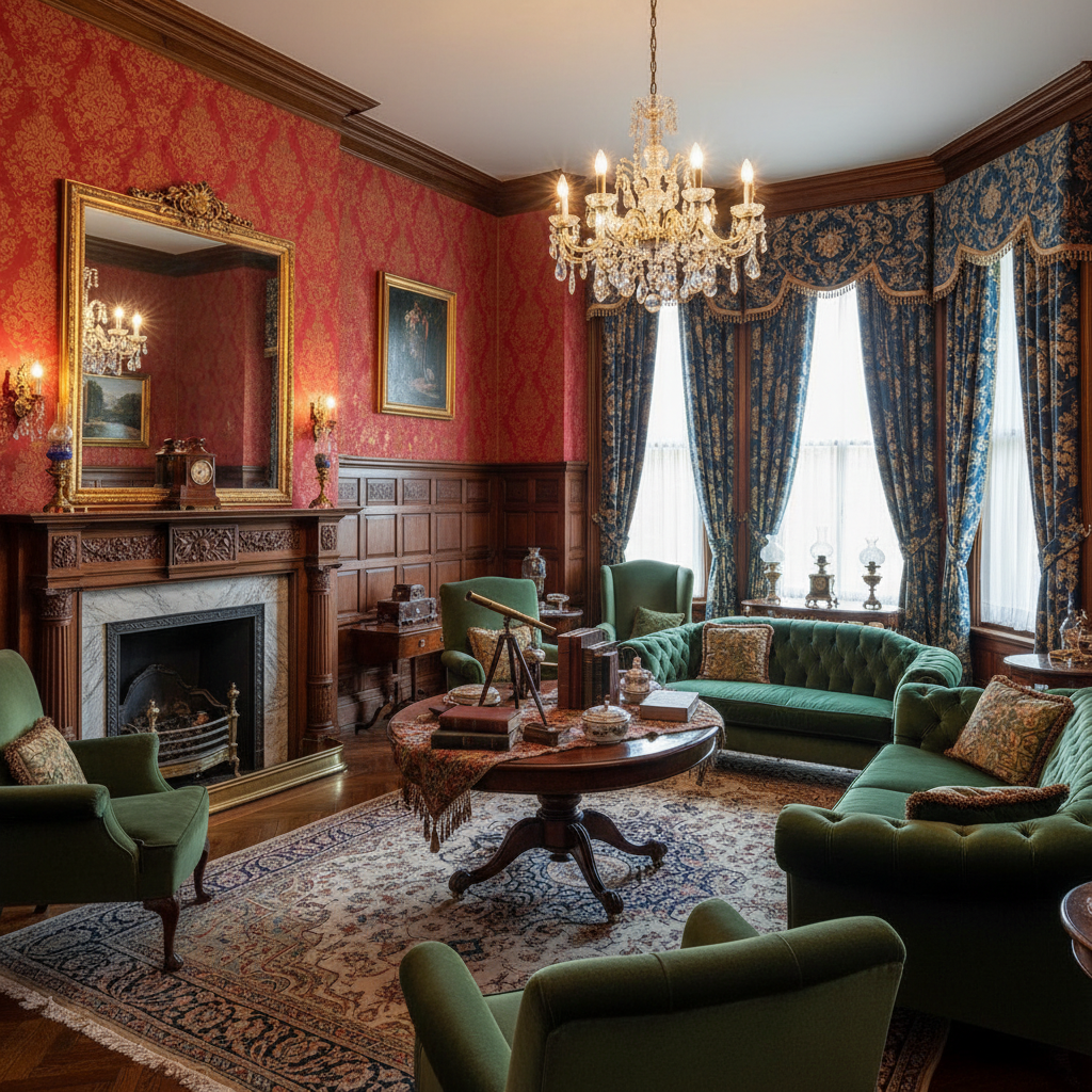 Step back in time with Grand Victorian Revival, a style that revels in rich details, intricate craftsmanship, and a sense of historical depth. The color palette often features deep, saturated hues like burgundy, forest green, navy blue, and rich browns, often paired with gold accents. Materials include dark, carved wood (walnut, mahogany), damask and brocade fabrics, and ornate wallpapers. Furniture silhouettes are typically heavy, elaborate, and deeply upholstered, often featuring tufting and detailed carvings. The atmosphere is one of dignified luxury, historical richness, and cozy grandeur.