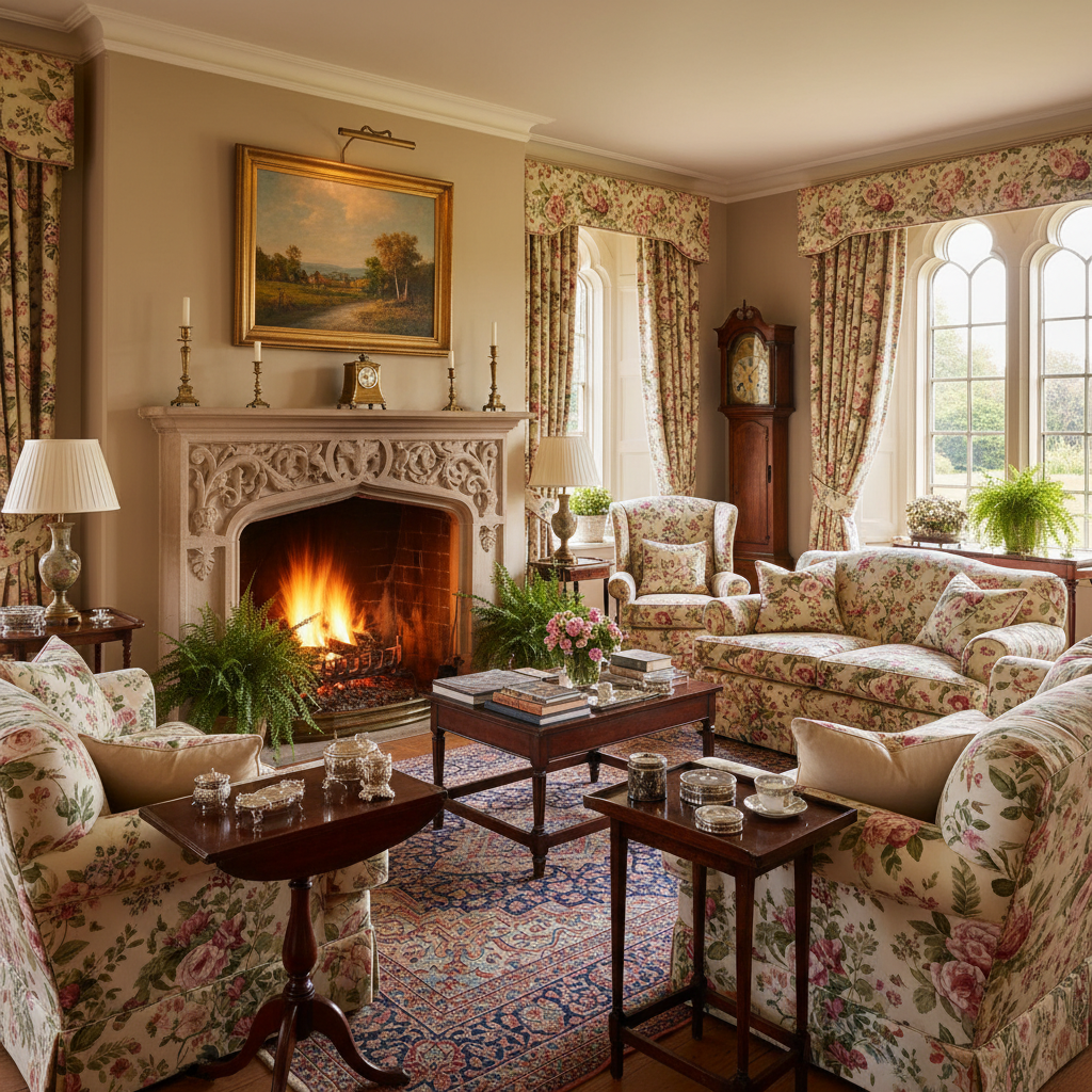 Evoke the charm and warmth of an English Country Manor with this grand, inviting style. It emphasizes comfort, heritage, and a lived-in luxury. The color palette features muted florals, deep greens, warm reds, and creamy whites. Materials include rich dark wood, chintz and floral fabrics, tweed, and antique brass. Furniture silhouettes are often traditional, comfortable, and generously sized, featuring upholstered armchairs and sofas. The atmosphere is one of cozy grandeur, timeless comfort, and inherited elegance.