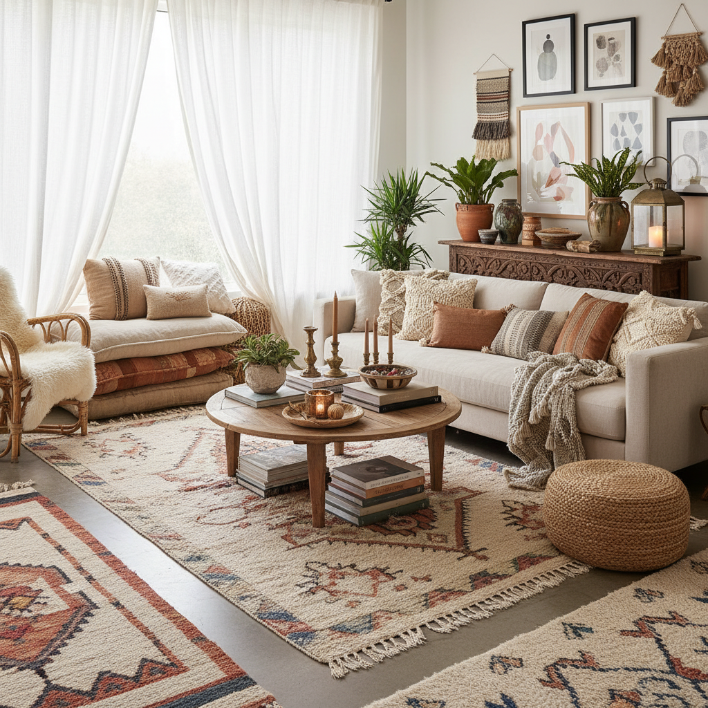 Boho Luxe elevates bohemian free-spiritedness with a sophisticated, high-end twist. This style is about layering textures, patterns, and global influences in a curated, luxurious way. The color palette is warm and inviting—earthy neutrals, terracotta, olive green, and deep blues, often with pops of brighter hues. Materials include rattan, macrame, rich wood, Moroccan rugs, velvet, and sheepskin. Furniture silhouettes are comfortable, often low-slung, and eclectic, blending vintage finds with artisanal pieces. The mood is one of relaxed grandeur, artistic freedom, and global charm.