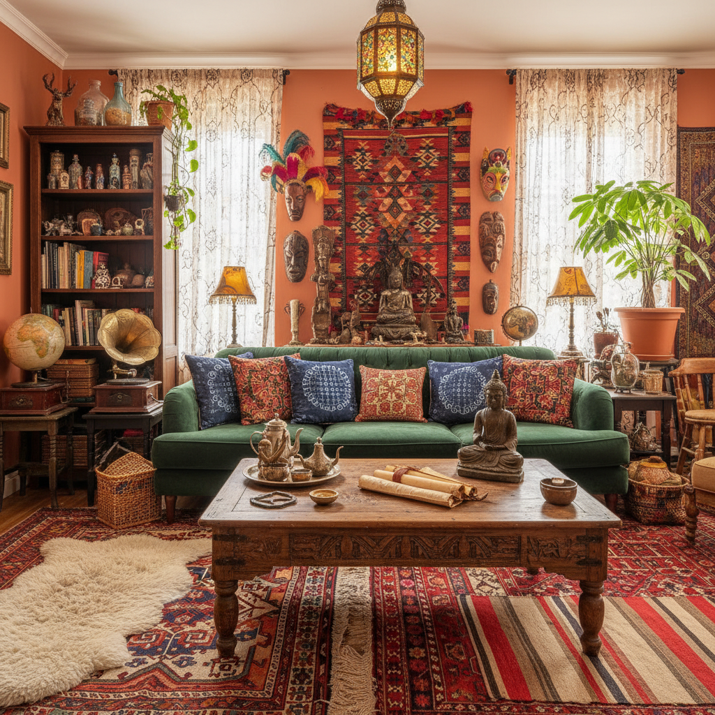Celebrate diversity and storytelling with Eclectic Global Grandeur. This look is about curating a collection of unique pieces from around the world, creating a richly layered and personal space. Color palettes are often vibrant and diverse, drawing inspiration from various cultures—deep reds, saffron yellows, indigo blues, and earthy neutrals. Materials include carved wood, intricate textiles (kilim, ikat), hammered metals, and handcrafted ceramics. Furniture silhouettes range from antique finds to contemporary pieces, all unified by a cohesive aesthetic. The atmosphere is one of adventurous luxury, cultural richness, and personal narrative.