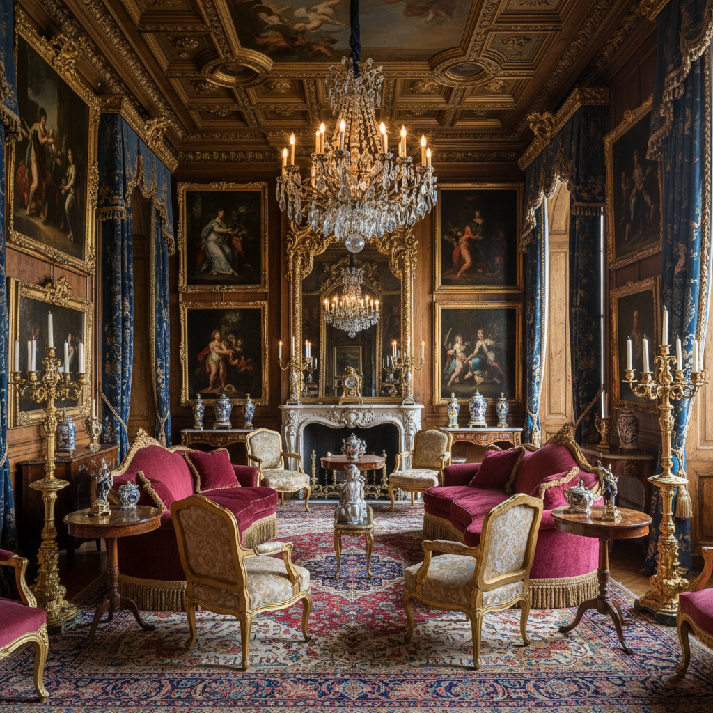 For ultimate theatricality, Baroque Drama delivers unparalleled grandeur. This style is characterized by elaborate ornamentation, dramatic contrasts, and a sense of movement and opulence. The color palette is often rich and deep—burgundy, forest green, royal blue, and black, all heavily accented with gold. Materials include carved giltwood, marble, heavy brocades, velvets, and damasks. Furniture silhouettes are highly ornate, curvilinear, and often gilded, featuring intricate carvings and elaborate upholstery. The atmosphere is one of magnificent splendor, powerful artistry, and historical richness.