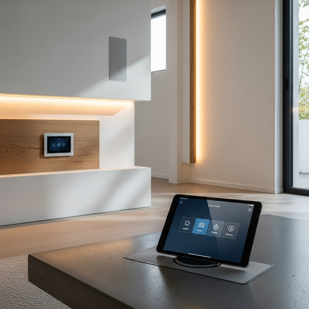The mood is one of effortless convenience, modern efficiency, and subtle luxury. It feels advanced and comfortable, allowing technology to enhance living without dominating the visual space.