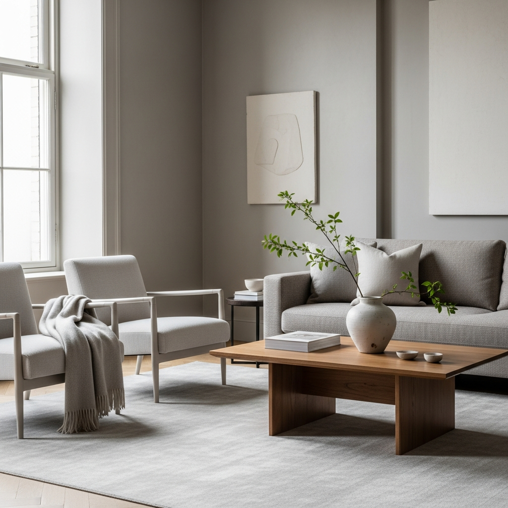 A subdued palette of warm grays, soft off-whites, and muted blues forms the base. Natural wood tones, from light birch to darker walnut, add a grounding warmth, creating a sophisticated yet inviting feel.