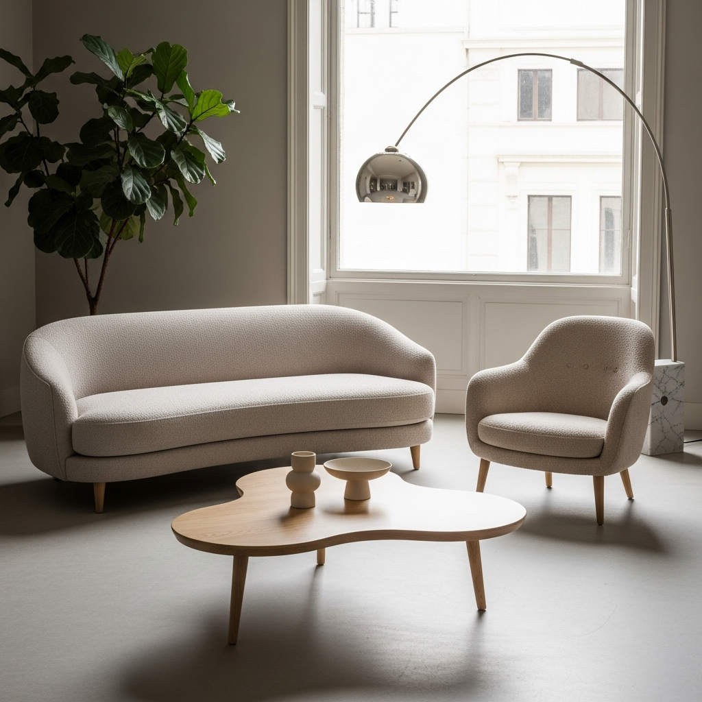 Sofas, chairs, and ottomans feature rounded edges, crescent shapes, and undulating lines. Even smaller decor items like vases and mirrors adopt these soft, inviting forms, creating visual harmony.