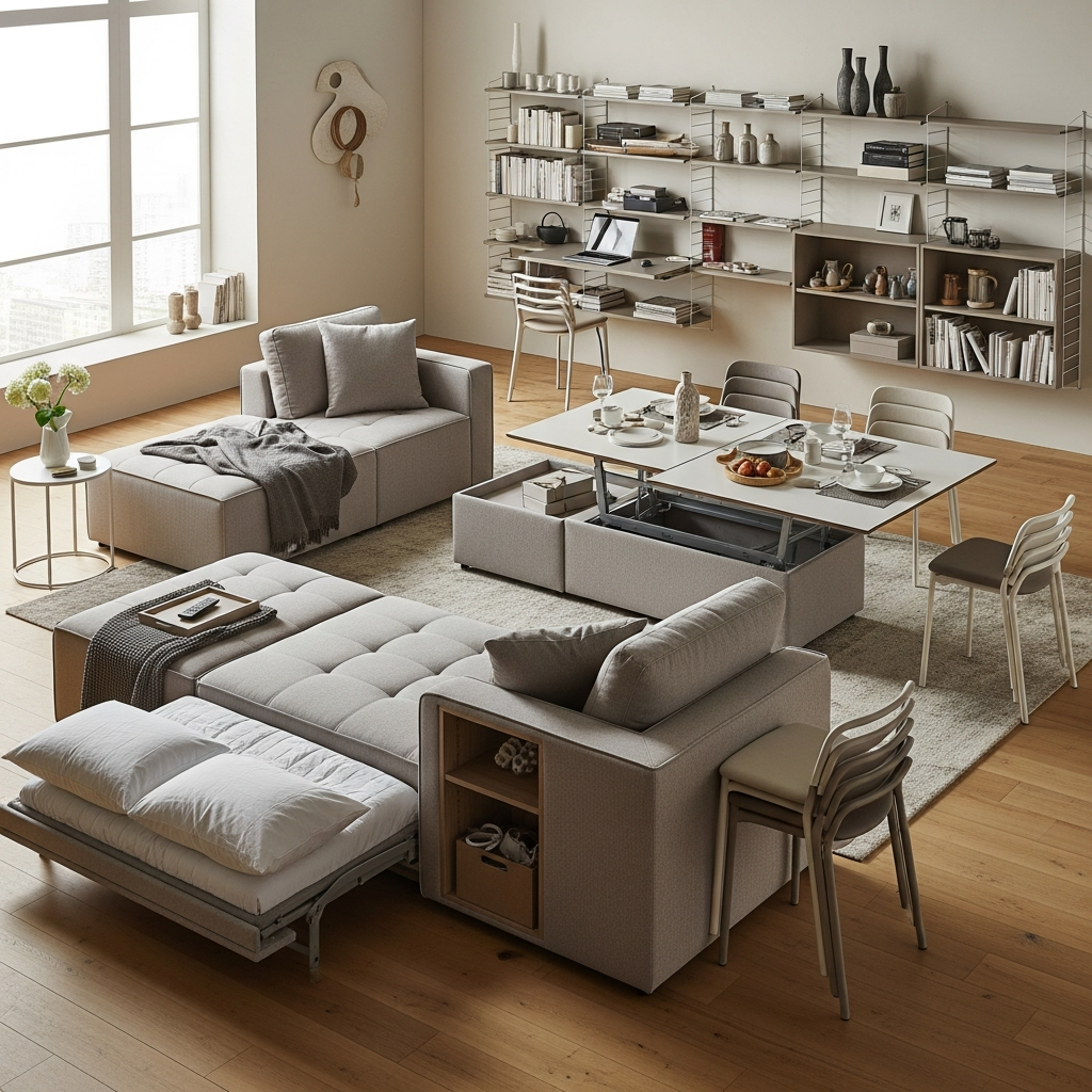 Pieces are often modular, foldable, or have hidden compartments. Sofas might convert to beds, desks might fold away, and shelving units can act as room dividers, maximizing utility.