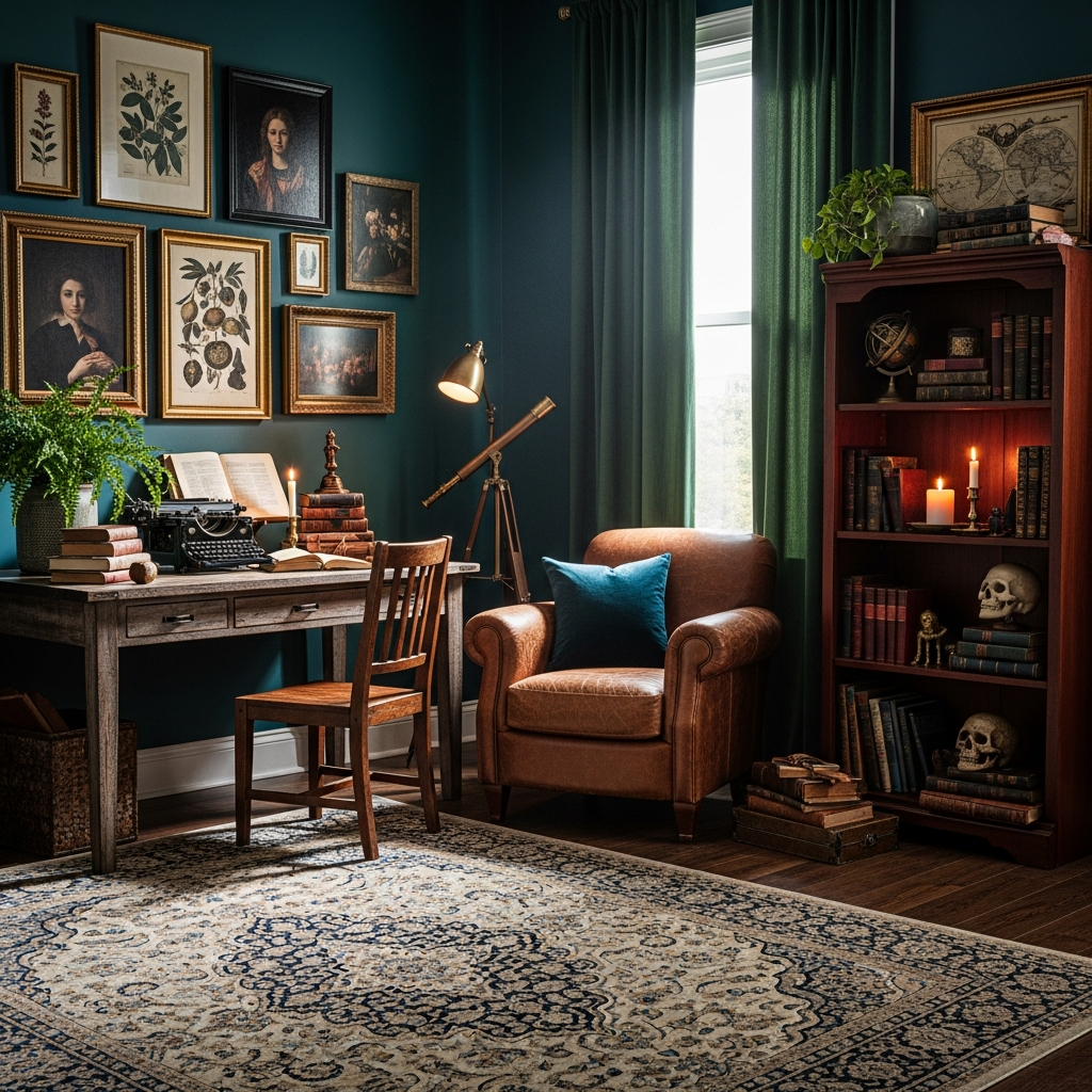 Dark wood, leather upholstery, velvet, brass, and aged paper are key. Books, maps, globes, and scientific instruments serve as decorative elements, enhancing the studious ambiance.