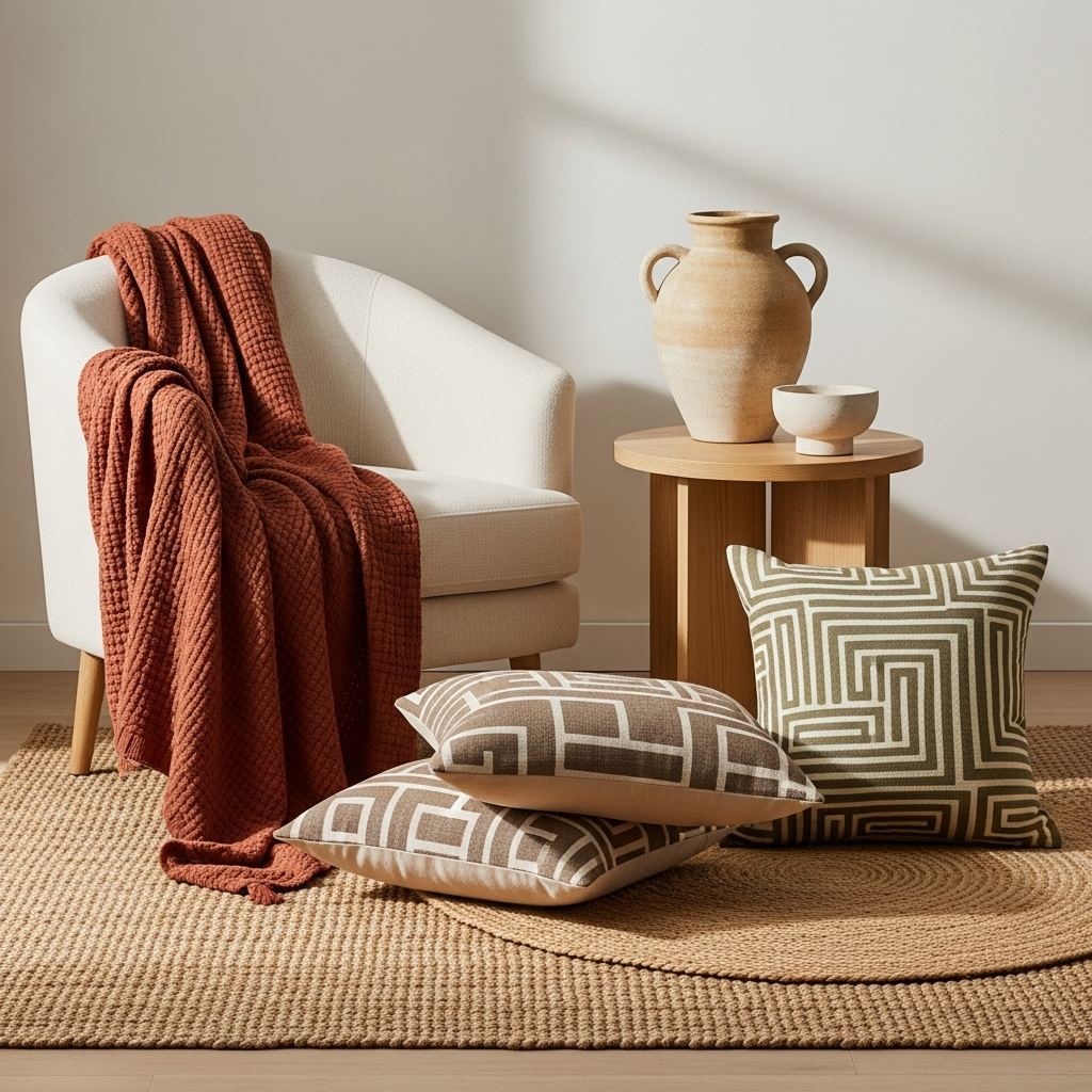 Think bouclé, velvet, chunky knits, linen, raw wood, polished stone, rattan, ceramic, and brushed metals. The contrast between rough and smooth, soft and hard, creates a dynamic sensory experience.