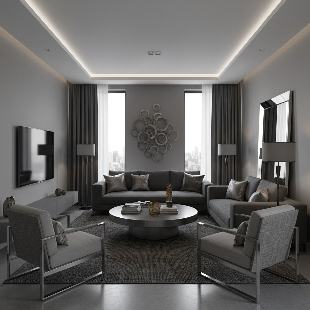 A sophisticated monochromatic grey palette forms an excellent base for an industrial living room. Layers of charcoal, slate, and ash grey create depth, allowing textures like wool, concrete, and brushed metal to shine, fostering a calm, urban atmosphere.