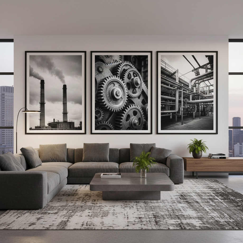 Adorn your walls with large-scale black and white photography of cityscapes, machinery, or abstract industrial forms. This art reinforces the urban theme, adding a layer of visual interest and a sophisticated, gallery-like feel.