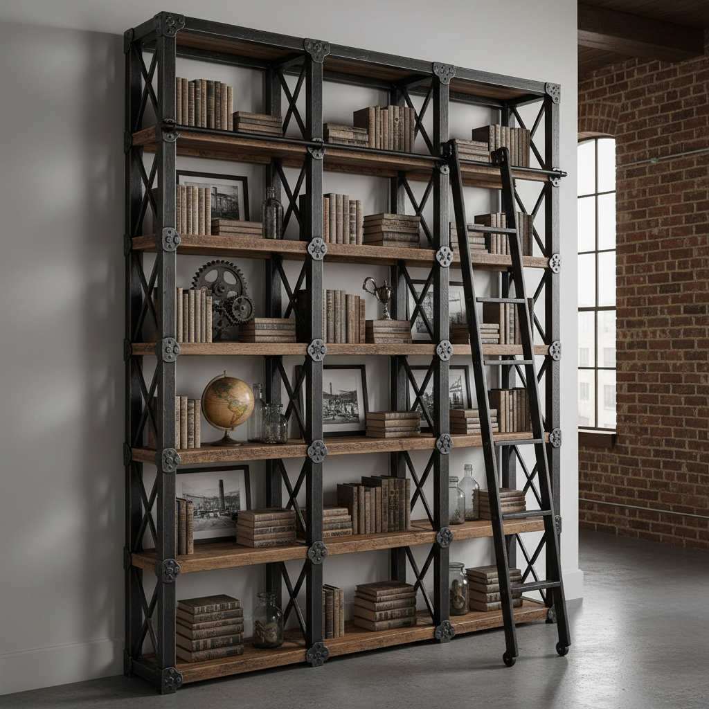 Choose bookshelves and storage units that combine dark metal frames with sturdy wooden shelves. These pieces are not just functional but also architectural, offering a structured yet open way to display personal collections and books.