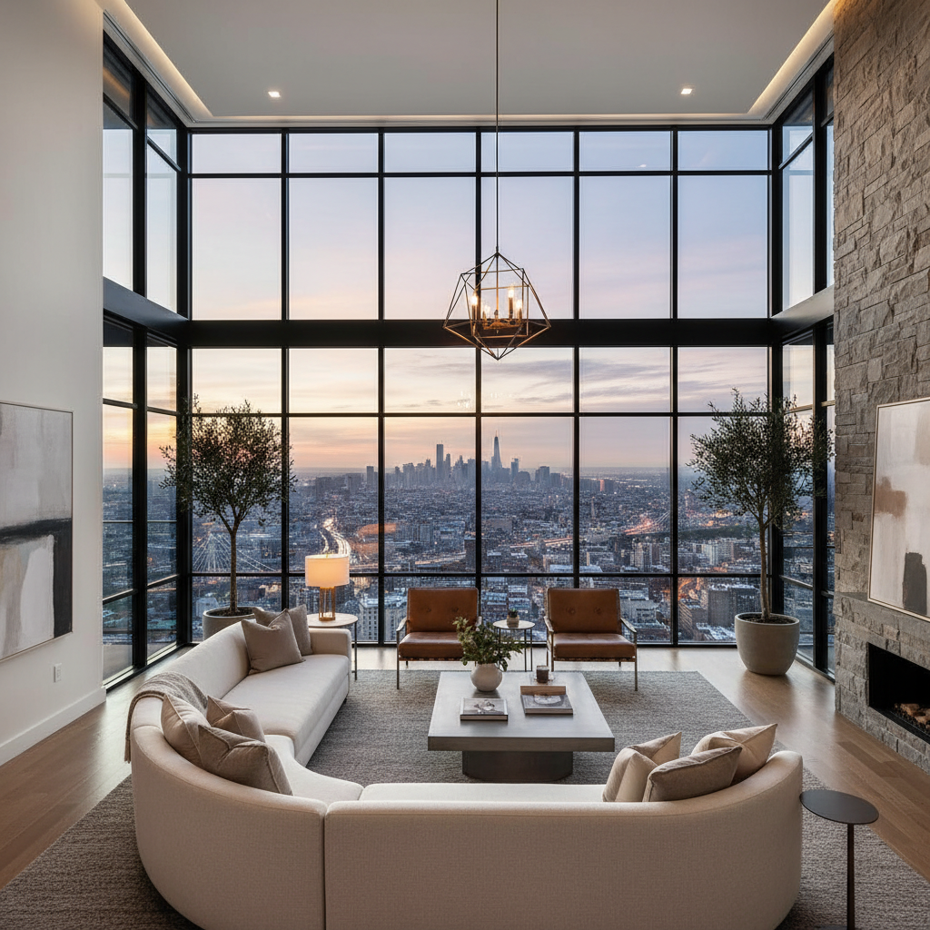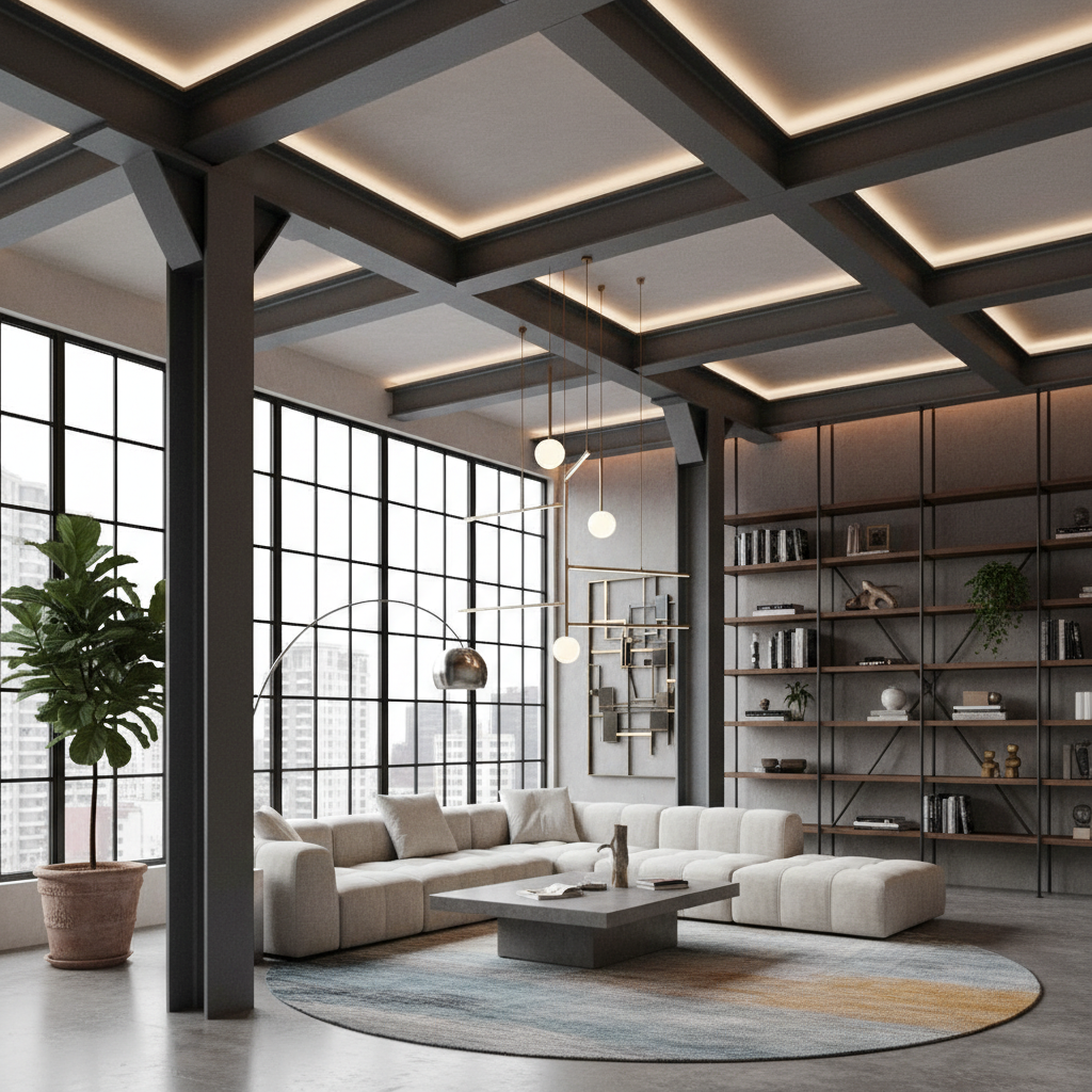 Large windows with dark, slender metal frames are a hallmark of industrial design, inviting abundant natural light. They create a strong visual grid, connecting the interior to the urban environment outside and adding a sleek, architectural dimension to the room.