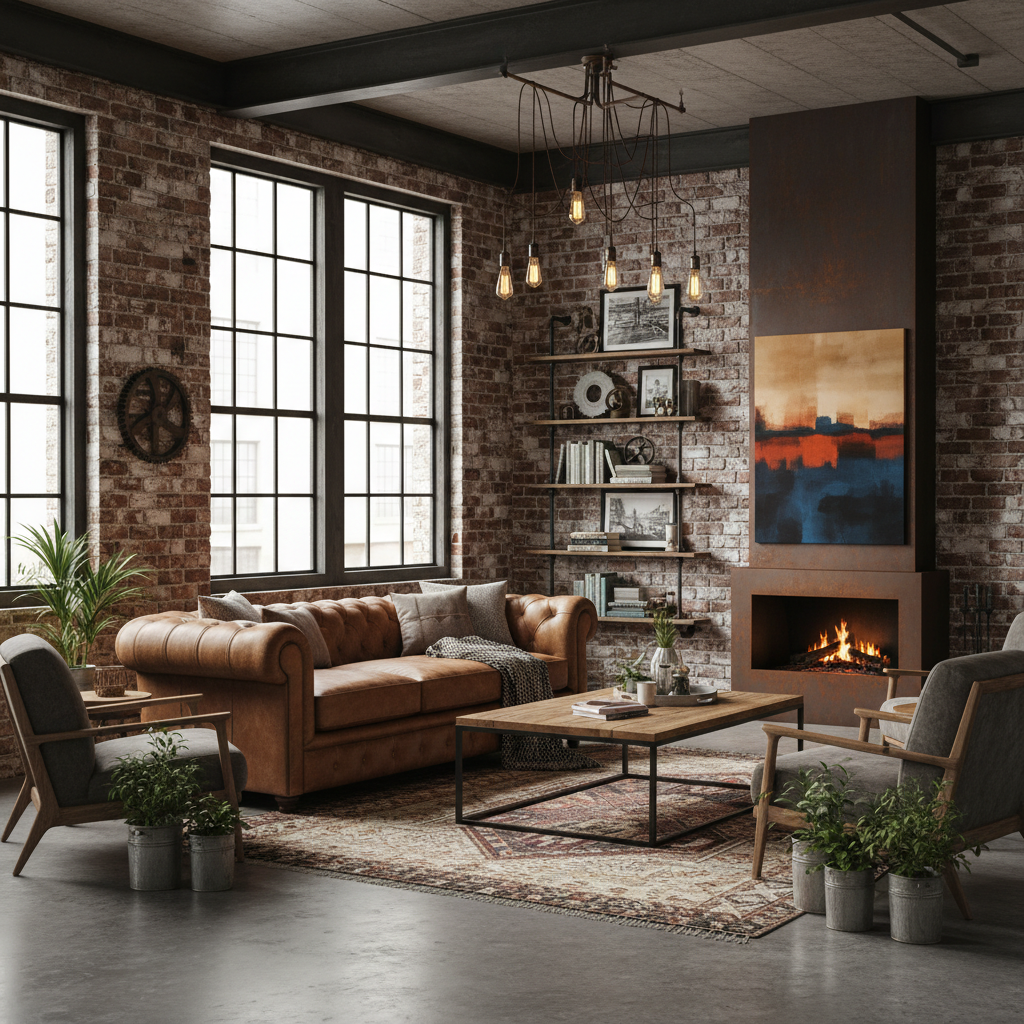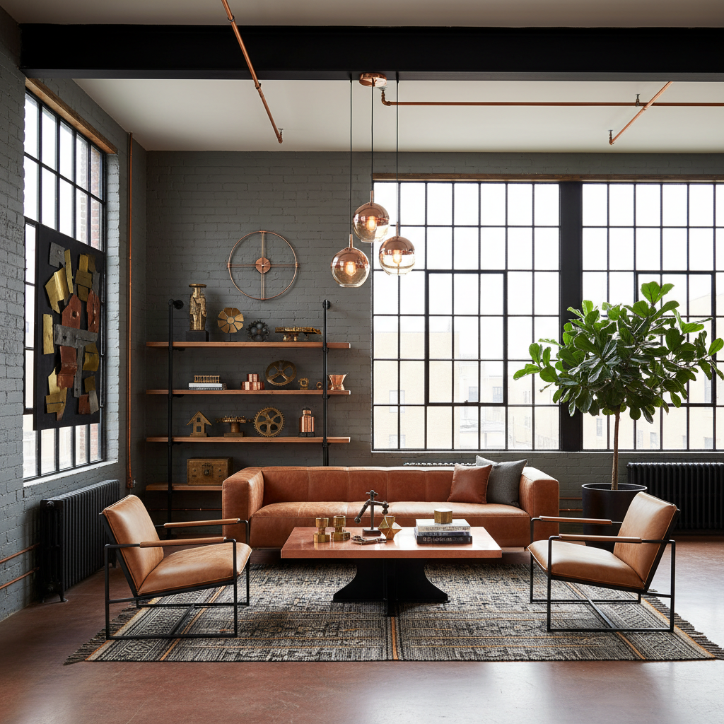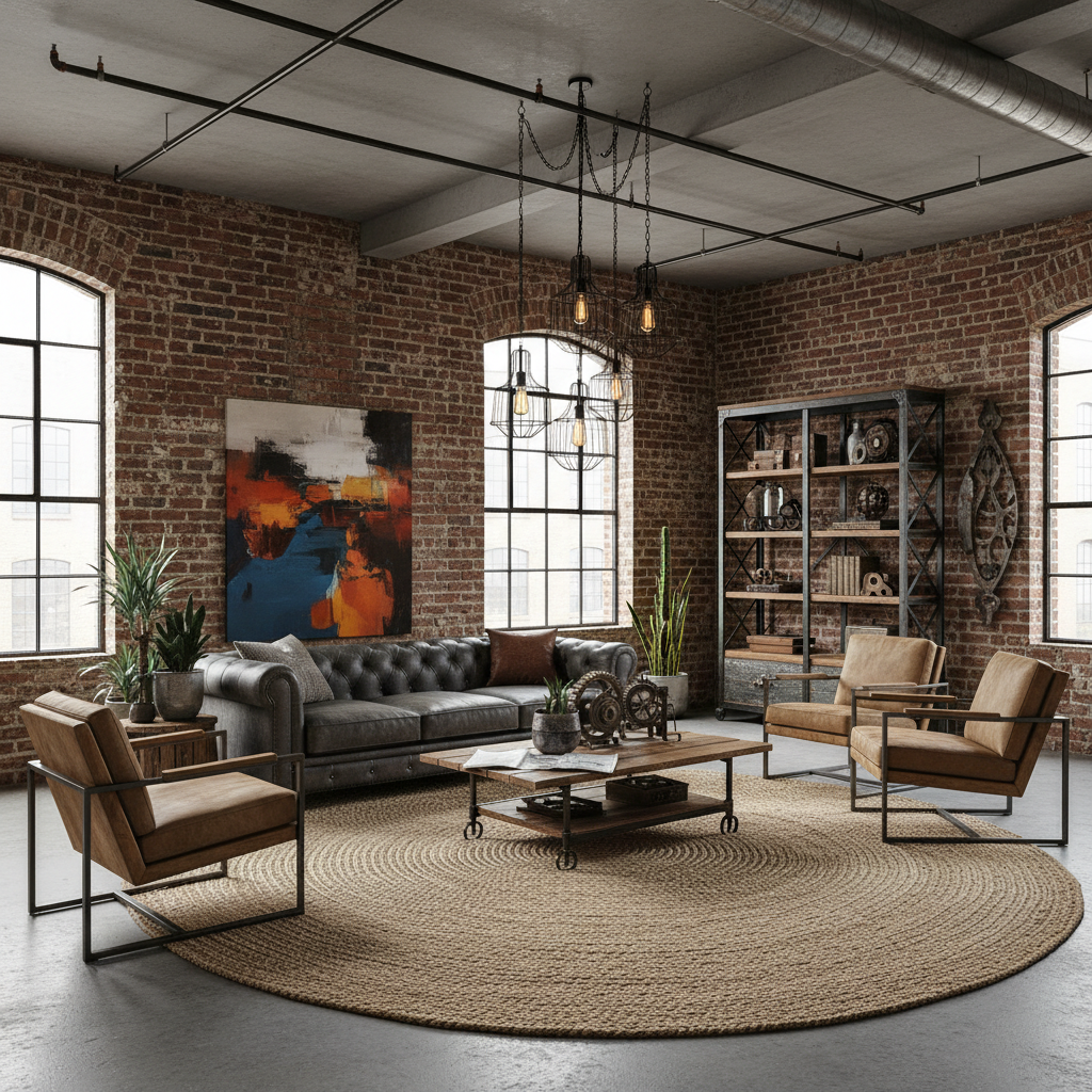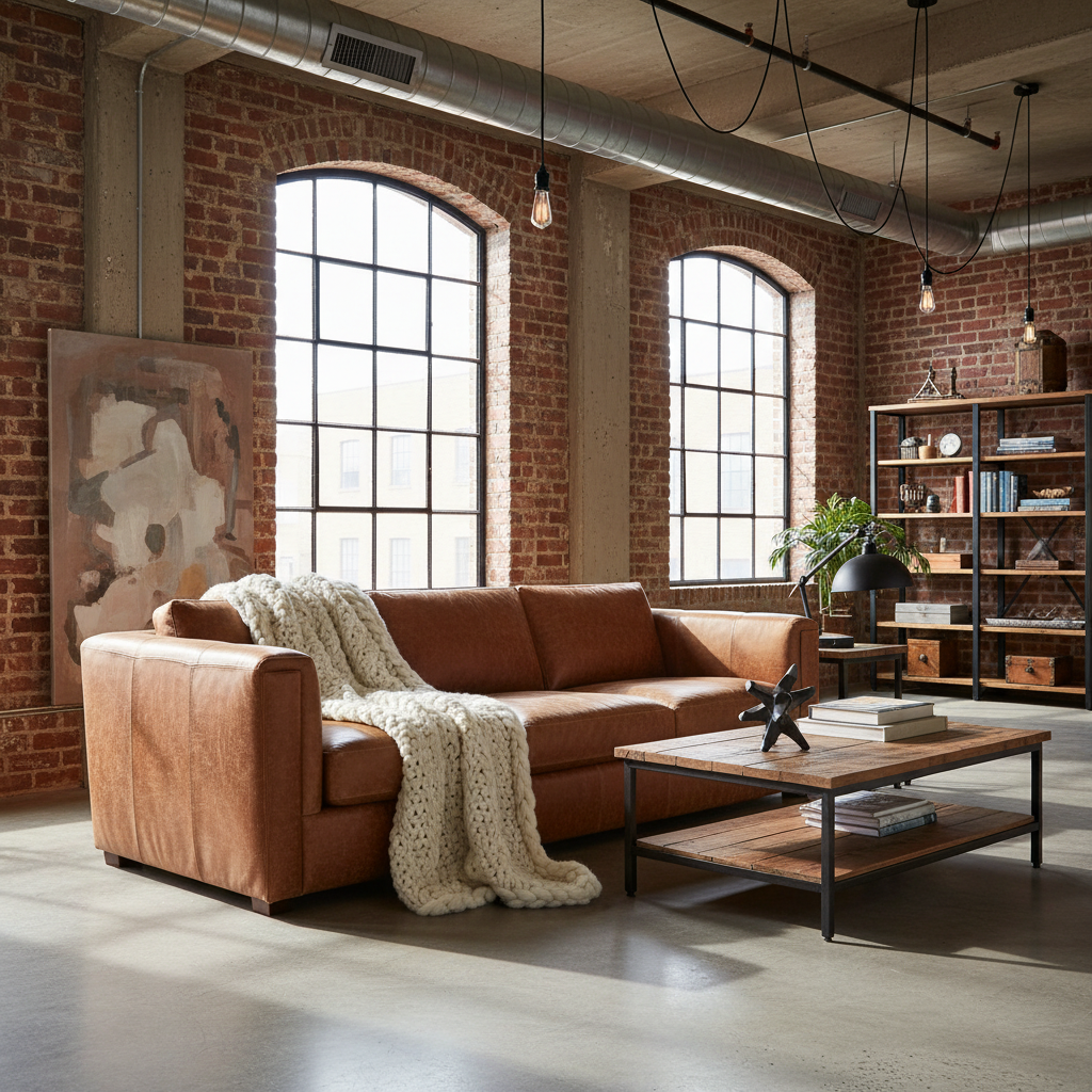 A distressed leather sofa or armchair in shades of cognac, chocolate, or charcoal brings immediate warmth and a touch of rugged luxury. Leather ages beautifully, adding character and a comfortable, lived-in feel that balances the harder industrial elements.