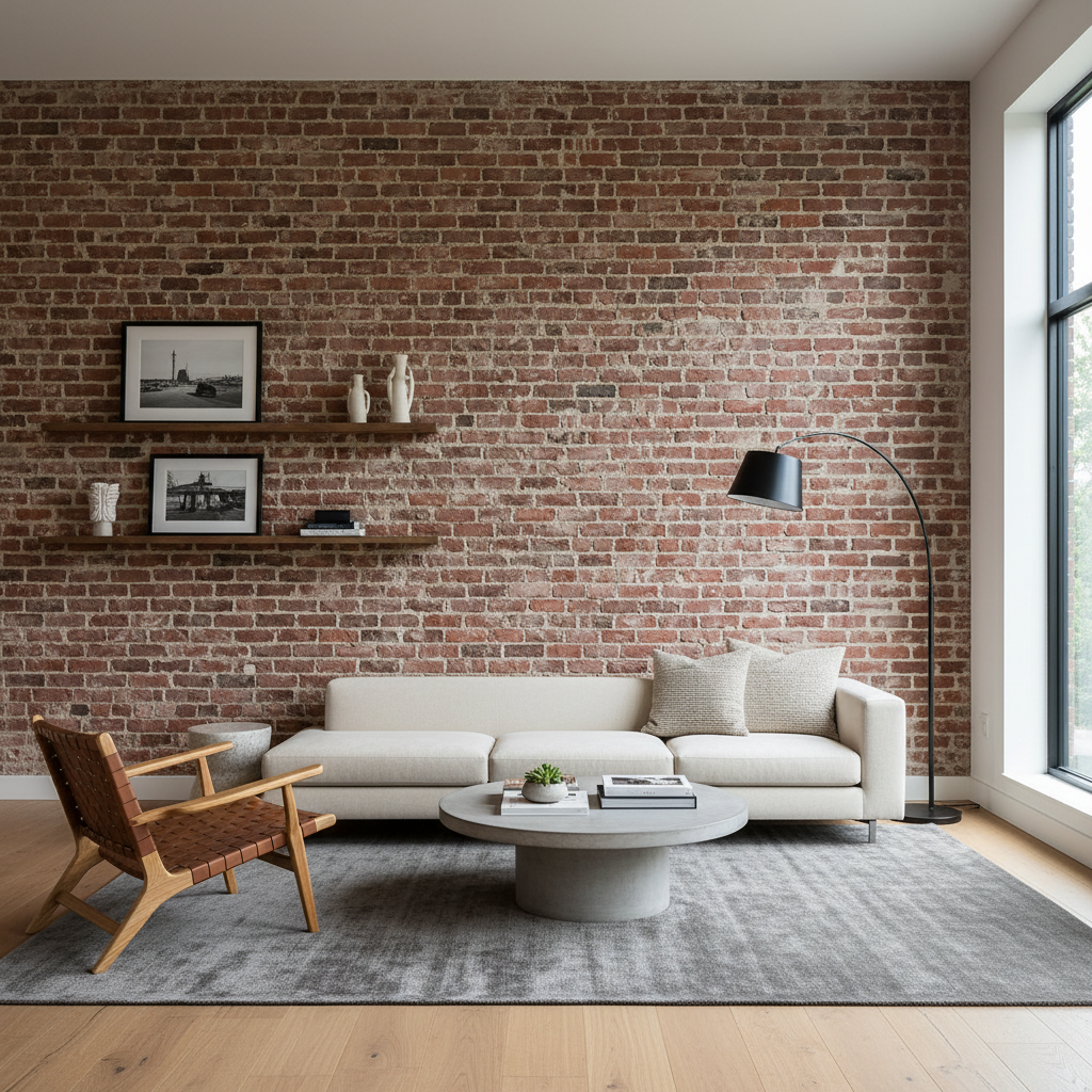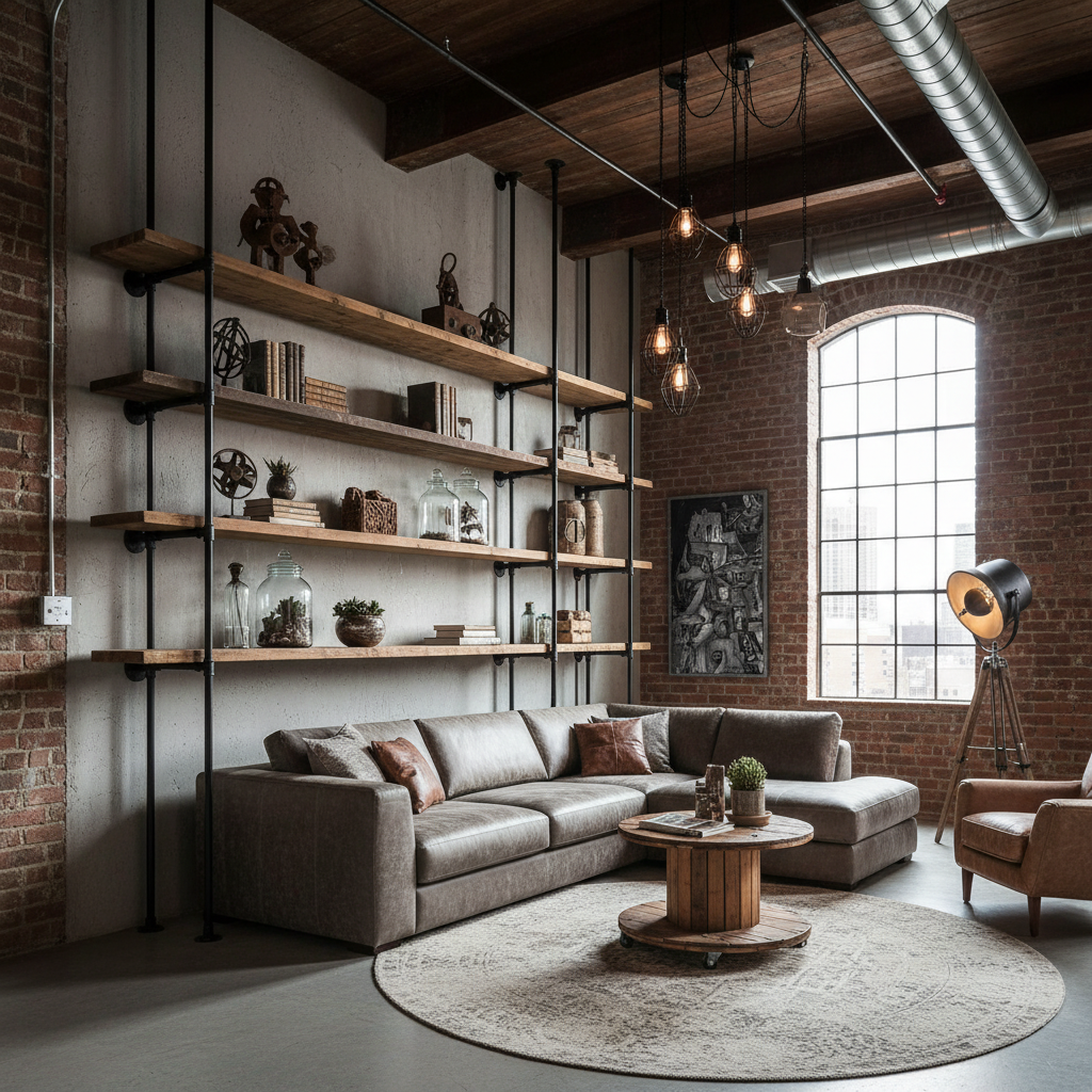 Embrace the quintessential industrial element with an exposed brick wall. Its rustic texture and earthy red tones instantly add warmth and history. Pair it with dark metal shelving and a plush grey sofa for a striking contrast, creating a cozy yet edgy focal point.