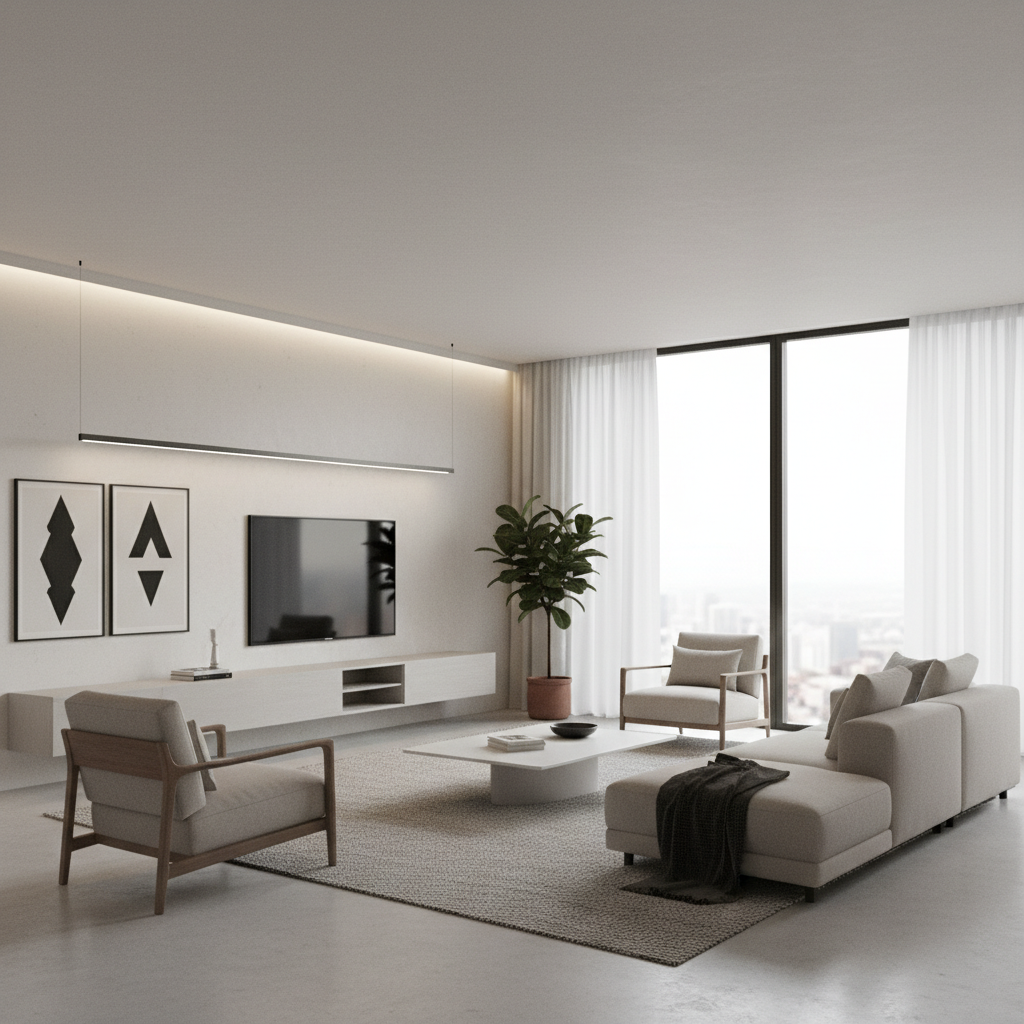 Modern minimalist living rooms celebrate simplicity, functionality, and uncluttered spaces. Furniture pieces are often characterized by clean lines, geometric shapes, and a restrained color palette focusing on neutrals like white, grey, and black, with occasional muted accents. Materials like polished chrome, glass, and light-toned wood enhance the airy feel.