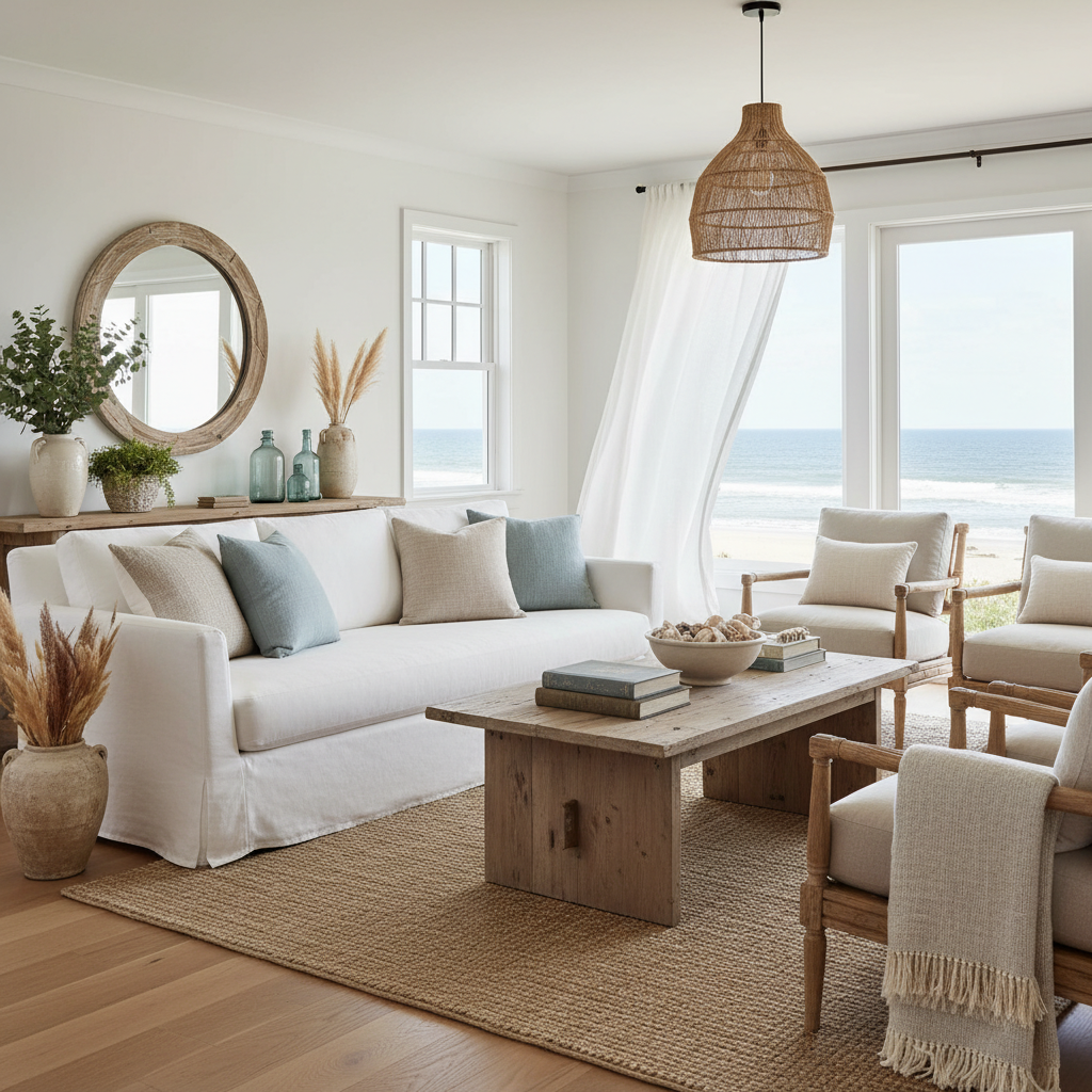 Coastal decor evokes the serene feeling of a beach house, characterized by light, airy spaces and natural elements. The mood is relaxed, refreshing, and bright. Color palettes focus on blues, greens, sandy neutrals, and crisp whites. Materials include wicker, rattan, light wood, and natural fabrics.
