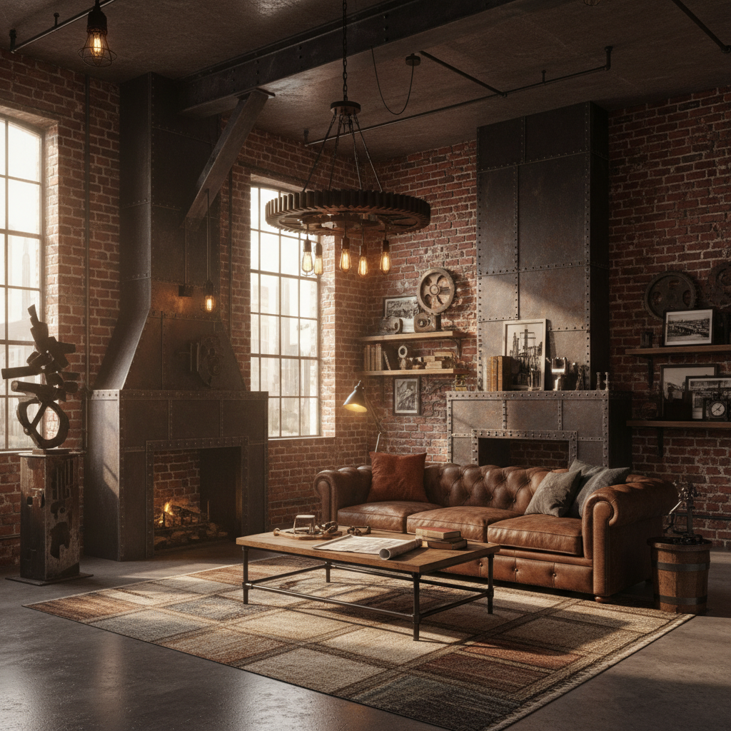 3. Factory-Style Coffee Table A coffee table made from raw metal, perhaps with visible rivets or a chunky wood top, grounds the space with its utilitarian aesthetic.