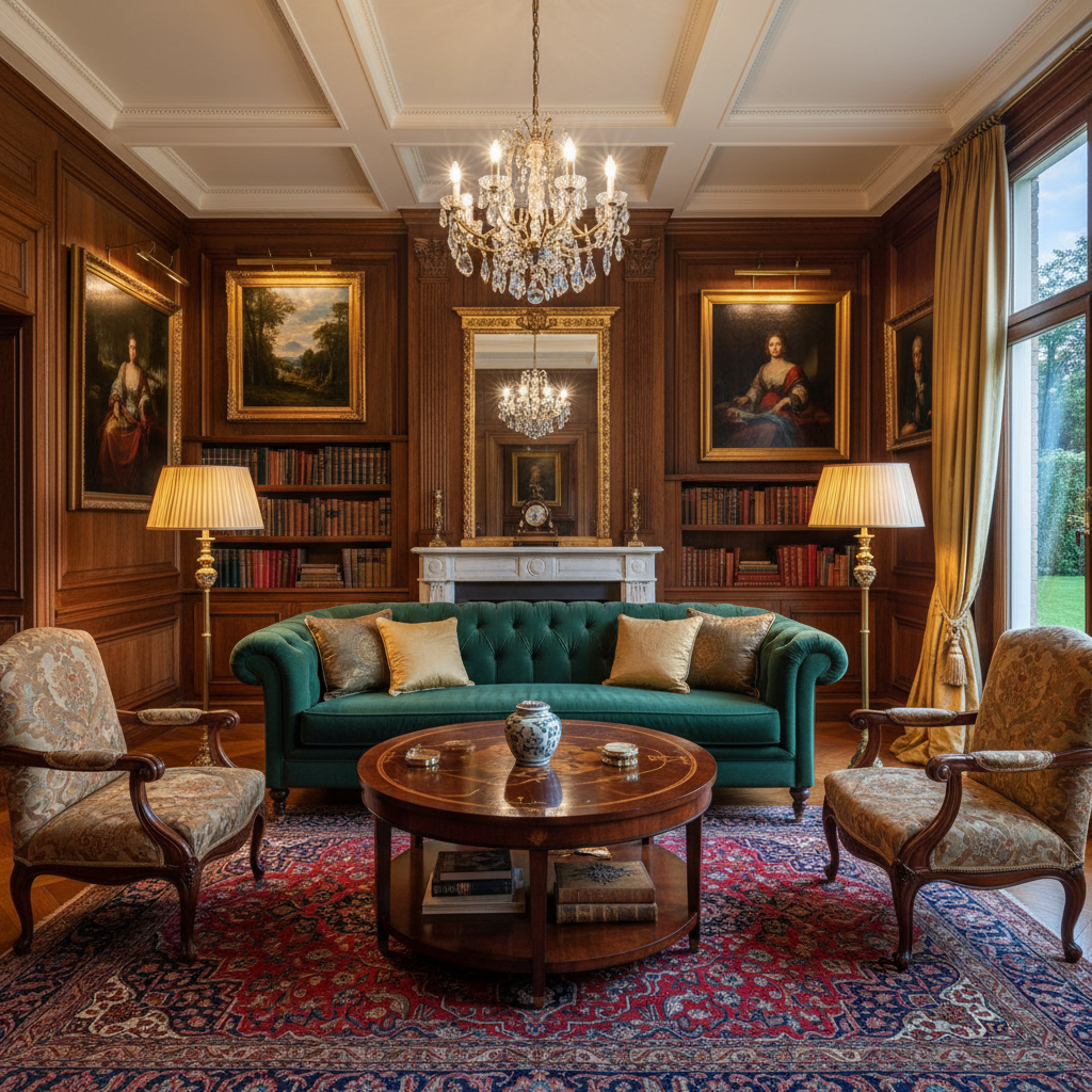 Classic elegance is about timeless appeal, sophisticated comfort, and refined details. This style often features stately furniture, rich fabrics, and a harmonious balance. The color palette tends towards deep jewel tones, muted pastels, and classic neutrals, paired with dark woods and polished metals.