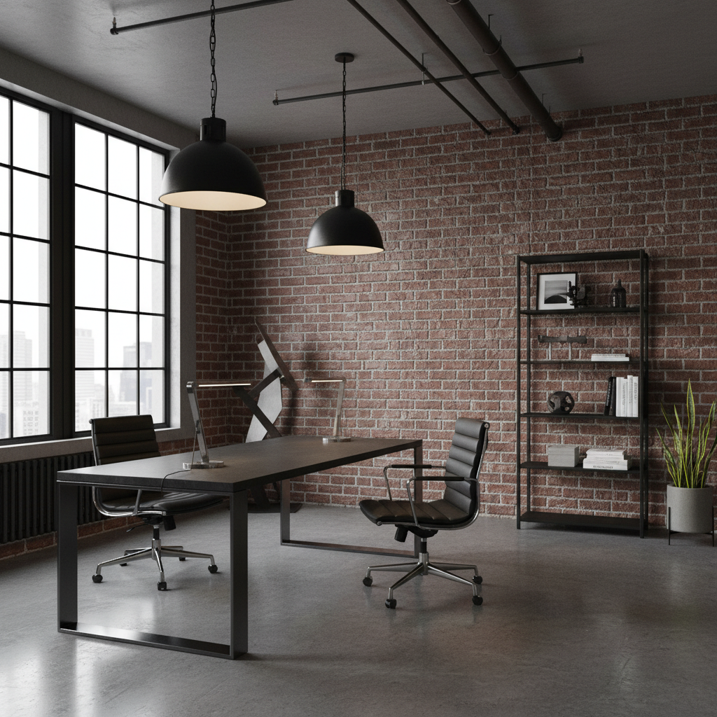 Industrial style celebrates raw, unfinished aesthetics, often drawing inspiration from old factories and warehouses. It features exposed elements, utilitarian furniture, and a robust, masculine mood. Materials include exposed brick, concrete, metal, and reclaimed wood, with a color scheme of greys, blacks, and earthy browns.