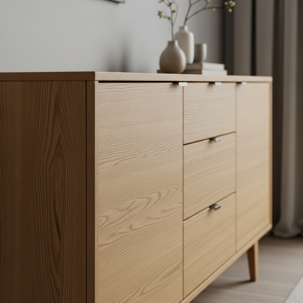 Sideboards are essential for storage and surface display. Scandinavian designs often feature light woods like oak or ash, emphasizing functionality, simplicity, and a connection to nature that keeps the room feeling bright.
