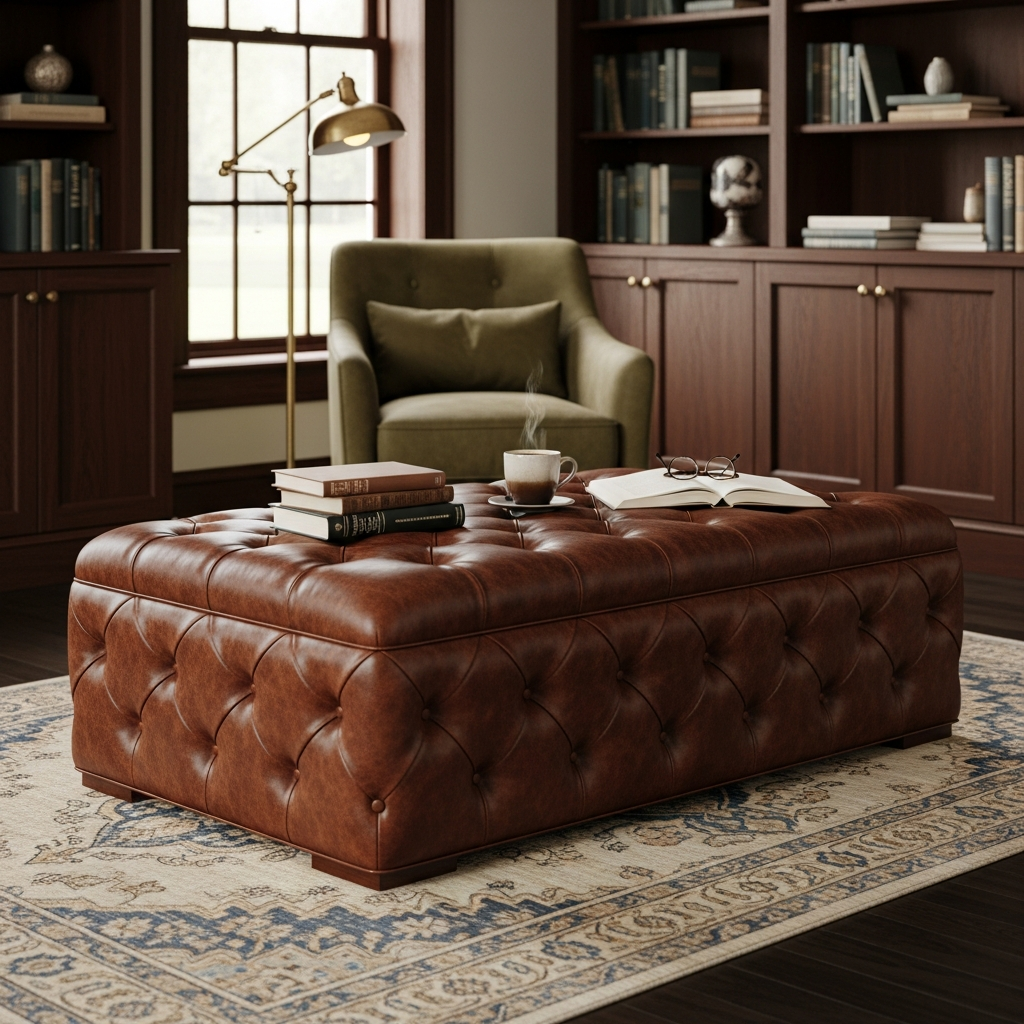 A tufted leather ottoman can serve multiple roles: a footrest, a coffee table, or extra seating. The leather patina develops over time, adding character and a sense of history to the living environment.