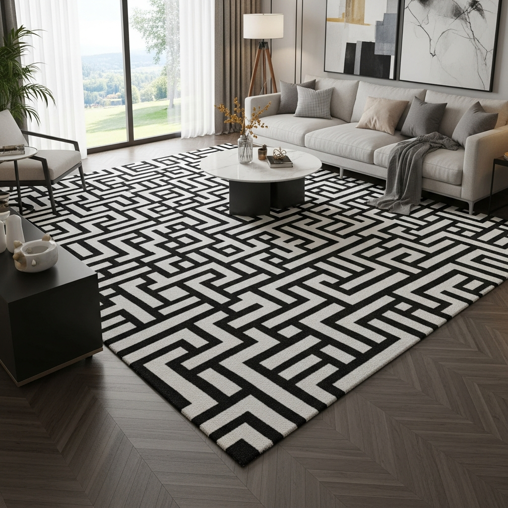 An area rug defines the space and anchors the furniture. Geometric patterns add a layer of visual complexity and color, helping to tie different elements of the room together while providing comfort underfoot.