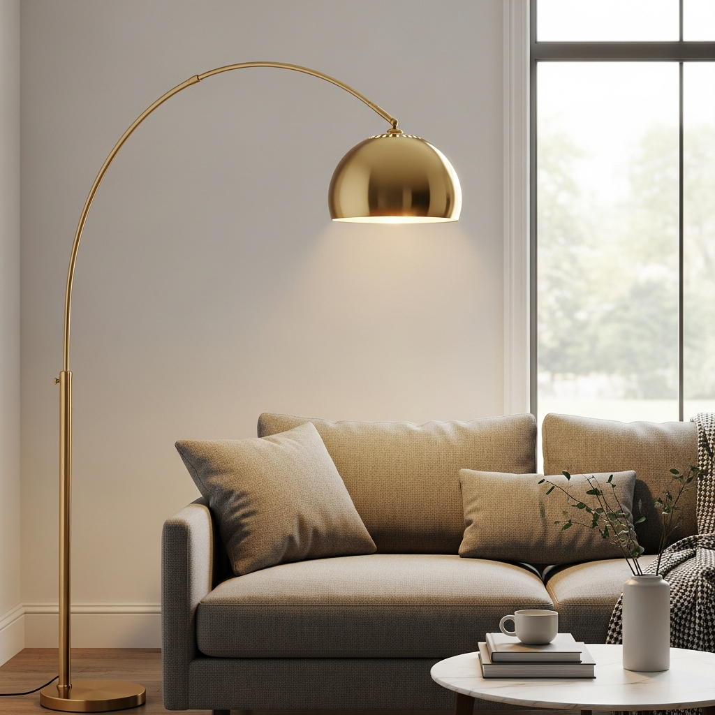 Lighting is a key furniture element. An arc floor lamp in a brass finish provides targeted task lighting while serving as a sculptural statement piece that adds height and sophistication to the room.