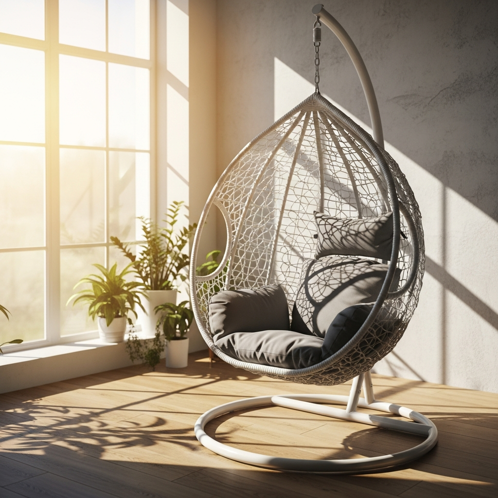 A hanging egg chair adds a playful and cozy element to the living room corner. Suspended from the ceiling or a stand, it creates a dedicated spot for relaxation and whimsical design.