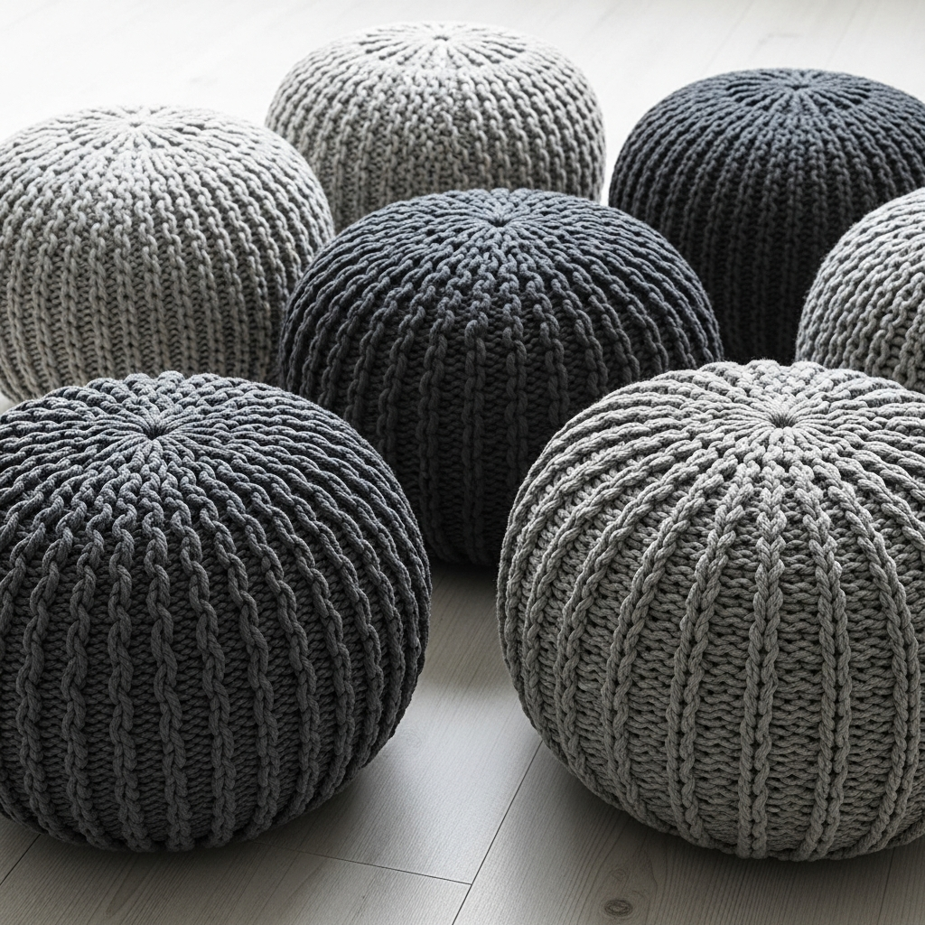 Floor poufs provide casual, flexible seating that can be moved easily. Available in various textures like knit or leather, they add a layer of comfort and help create a relaxed, communal atmosphere.